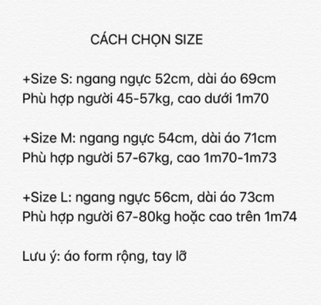 + Chất vải cotton 4 chiều, không xù lông, không ra màu + Đường may sắc xảo, bền đẹp + In decal dẻo sắc nét + Kích thước các size: -Size S: ngang ngực 52cm, dài 69cm -Size M: ngang ngực 54cm, dài 71cm -Size L: ngang ngực 56cm, dài 73cm +Lưu ý: -Khách hàng được đổi hàng thoải mái, phí ship khách chịu