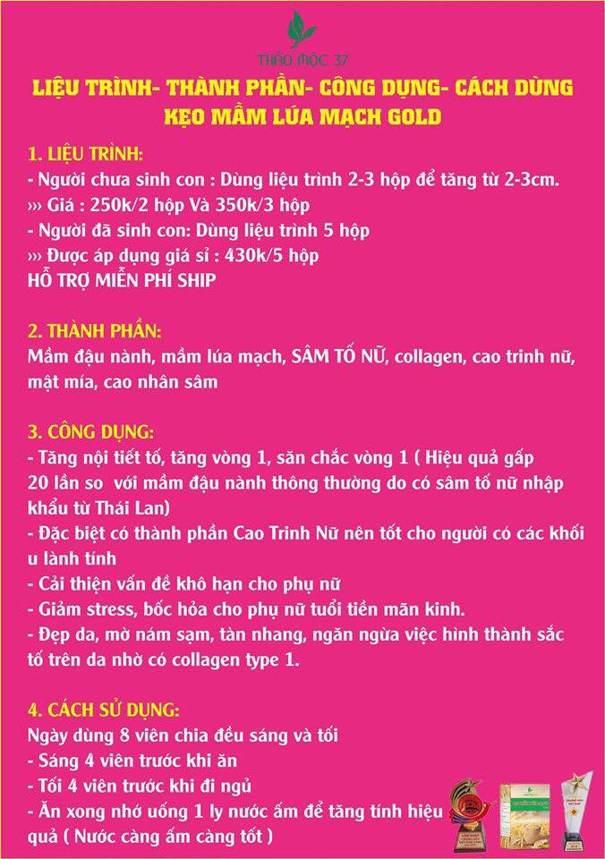 Cân bằng nội tiết . bí quyết trẻ đẹp Ngực cải thiện rõ rệt : TO & CỰC SĂN Da cải thiện trông thấy : TRẮNG HỒNG & MỊN Dáng – đã đc kiểm chứng : Tiêu mỡ bụng Nội tiết : TAN NÁM , MỜ THÂM ,hết mụn, tăng cân giảm cân theo ý muốn. GIẢM KHÔ HẠN – CÂN BẰNG HAM MUỐN SỨC khoẻ : Giảm stress , nóng nảy bốc hoả , ️Phòng trống ung thư,Ngăn ngừa biệnh tim mạch, Ngủ sâu và ngon giấc hơn, Mẹ sâu sinh nhiều sữa KẸO MẦM LÚA MẠCH GOLD THẢO MỘC 37 1. Công Dụng – Da mịn trắng sáng . giảm thâm nám tàn nhang – Cải thiện nội tiết tố nữ giảm khô hạn – Điều kinh nguyệt . ngăn ngừa tình trạng bốc hỏa . tiền mãn kinh – Lấy lại vóc dáng săn chắc thon gọn – Ngủ sâu và ngon giấc hơn – Mẹ sâu sinh nhiều sữa – Ngăn ngừa biệnh tim mạch – Phòng trống ung thư – Tăng size vòng một hiểu quả – Cân bằng nội tiết . bí quyết trẻ đẹp – Ngực cải thiện rõ rệt : TO & CỰC SĂN – Da cải thiện trông thấy : TRẮNG HỒNG & MỊN – Dáng – đã đc kiểm chứng : Tiêu mỡ bụng – Nội tiết : TAN NÁM , MỜ THÂM ,hết mụn, ngan ngừa hình thành các sac tố trên da là nhờ có collagen tuýp `. GIẢM KHÔ HẠN – CÂN BẰNG HAM MUỐN – SỨC khoẻ : Giảm stress , nóng nảy bốc hoả , ️ Điều hoà kinh nguyệt , tăng khả năng thụ thai , phòng chống ung thư , các bệnh nhạy cảm của phụ nữ .️ – Đạc biệt có thành phần cao trinh nữ nên tốt cho những người có khối u lành tính 2. Thành Phần Mầm đậu nành, mầm lúa mạch, mật mía, sâm tố nữ, collagen tuype 1, cao trinh nữ, cao nhân sâm. 3. Hướng dẫn sử dụng Ngày dùng 8 viên chia đều sáng và tối – Sáng 4 viên trước khi an – Tối 4 viên trước khi đi ngủ – An xong nhớ uống kèm ly nc ấm, nước càng ấm càng tốt để tang tính hiệu quả 4. Chống chỉ định Phụ nữ có thai 5. Hạn Sử Dụng 24 tháng kể từ ngày sản xuất 6. Cách bảo quản Để nơi khô mát tránh ánh nang trực tiếp