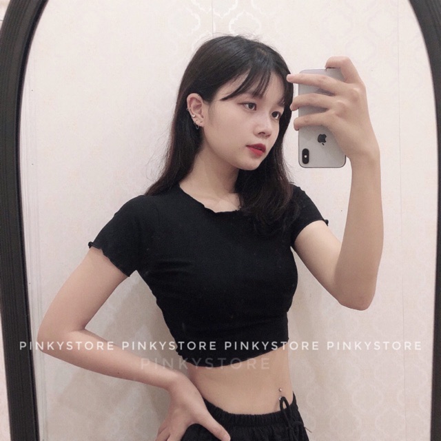 Form áo ôm đơn giản dễ mặc phối gì cũng xinh Dáng croptop mặc đến ngang eo trên rốn (chiều dài áo tầm 37-38cm ạ) Áo chạy cuốn biên viền bèo quanh cổ áo và nguyên áo chứ ko có cổ như áo cổ bèo đâu ạ