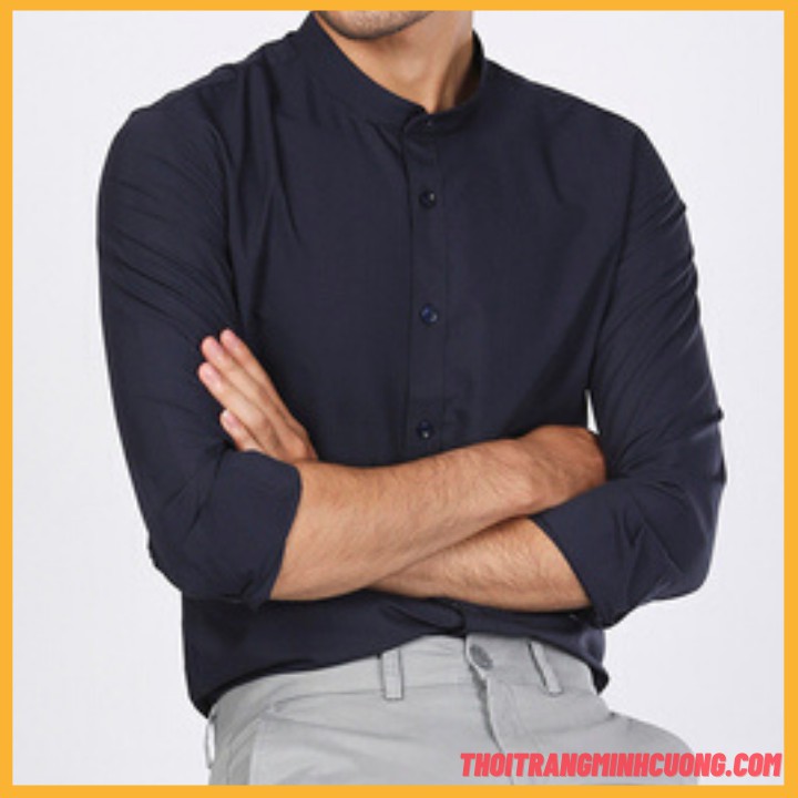 Bộ sản phẩm: Áo sơ mi nam dài tay, kiểu áo cổ tàu (trắng, đen), dáng ôm vải lụa cotton co giãn nhẹ siêu mát.