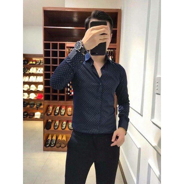 Bộ sản phẩm: áo sơ mi nam Vettino họa tiết chấm bi cao cấp Cao Cấp.