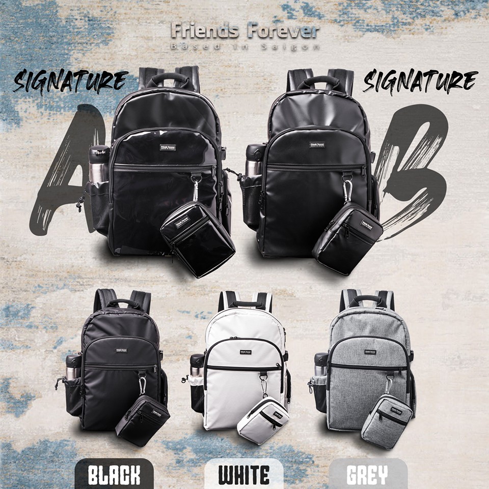 – Twins Backpack Là chiếc balo đặc biệt khi bạn mua sẽ được tặng kèm túi đeo chéo Twins mini có thể tháo rời . – Twins Backpack có 13 ngăn : 7 ngăn bên ngoài ,4 ngăn bên trong và 2 ngăn túi nhỏ tặng kèm – Backpack có 5 phiên bản : Đen / Trắng / Xám / Signature A / Signature B . – Kích thước : 45 x 30 x 14 cm. – Chất liệu vải bố polyeste cao cấp chống thấm nước. – Đặc biệt 2 bản Signature sử dụng chất liệu PU nhập khẩu cao cấp. – Backpack Đựng được laptop 15’6 inc trở xuống, toàn bộ các ngăn bên trong, bên ngoài đều được trang bị chống sốc, chống nước, chống bụi. – Quai đeo và mặt sau balo được thiết kế với tiêu chí chống gù lưng, nhứt mỏi vai nhờ miếng đệm rất dày và thoáng khí. – Sản phẩm được bảo hành trọn đời đường kim, mũi chỉ. khóa kéo trọn đời tại FFStore. .