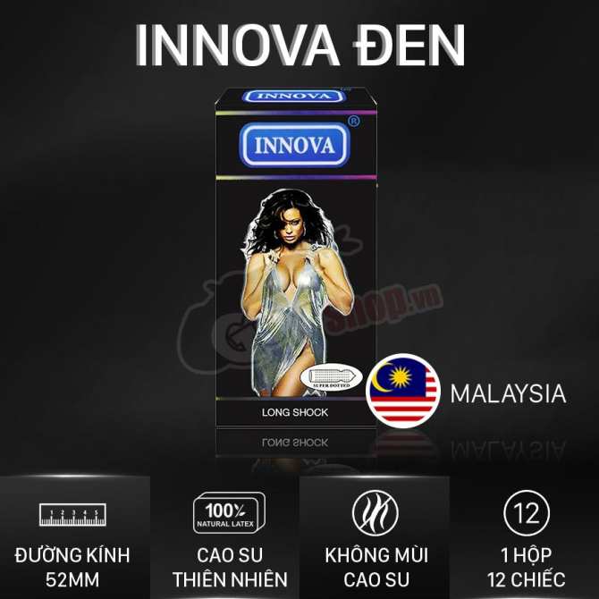 CAM KẾT HÀNG CHÍNH HÃNG 100% Kéo dài thời gian cực tốt Các hạt siêu gai được thiết kế nổi bật trên toàn thân Tăng hưng phấn mãnh liệt cho đối phương An toàn cho người dùng Bao cao su Innova hộp đen Kéo dài thời gian quan hệ: Giống như bao cao su Innova vàng, bao cao su Innnova đen(Black) có chứa 9% chất Lidocain giúp phái mạnh ghi điểm trong mắt bạn gái, thỏa sức thể hiện bản lĩnh chốn phòng the, mười lần quan hệ thì cả 11 lần khiến nàng thỏa mãn, sung sướng. Phái mày râu, đặc biệt là cánh đàn ông bị chứng xuất tinh sớm, thì đây chính là vũ khí bí mật hoàn hảo, khiến nàng tâm phục khẩu phục.Gai lớn: Nếu như Innova vàng chứa gân và gai nhỏ li li, dành cho chị em phụ nữ thích sự nhẹ nhàng, thì Innova đen (Black) lại đem lại trải nghiệm vô cùng thú vị với thiết kế gai lớn và không có gân, giúp kích thích mạnh mẽ khoái cảm, khơi dậy đam mê mà vẫn an toàn tối đa. Chất liệu: Cao su thiên nhiên không mùi cao cấp với độ co giãn rất tốt Bao cao su Innova Super Dotted giúp kéo dài thời gian quan hệ, các hạt siêu gai được thiết kế nổi bật trên toàn thân mang lại cảm giác mãnh liệt tột cùng cho đối tác của bạn. Bao cao su Innova đen (Black) được xem là dòng sản phẩm bao cao su kéo dài thời gian cực tốt, giúp phái mạnh kiểm soát và kéo dài thêm thời gian lên đỉnh, khiến nàng thỏa mãn. Hơn nữa, đây đích thực là sản phẩm làm hài lòng cả đôi, khi mang trên mình thiết kế gai lớn (super dotted) đem lại cho nàng cảm giác được mas sage, kích thích do các gai lớn này cọ xát vào thành a d, kích thích dây thần kinh khoái cảm, sướng hơn cả khi không dùng bao. Hướng dẫn sử dụng: Để đạt hiệu quả cao khi sử dụng bao cao su INNOVA giúp kéo dài thời gian cần chú ý các bước sau : Nên mas sage nhẹ nhàng toàn thân dv trước khi mang bao cao su Sau khi d v cương cứng và cảm giác nhiệt độ ở d v ấm lên, xé vỏ bao cao su và mang vào theo đúng chiều, sau đó vuốt nhẹ nhàng bao cao su đến cuối thân dv Tiếp tục mass age đầu d v nhẹ nhàng cho đến khi dung dịch bôi trơn tan đều trên đầu d v Thời gian từ 30 giây – 1 phút Bạn có thể bắt đầu cuộc hành trình khám phá cảm xúc