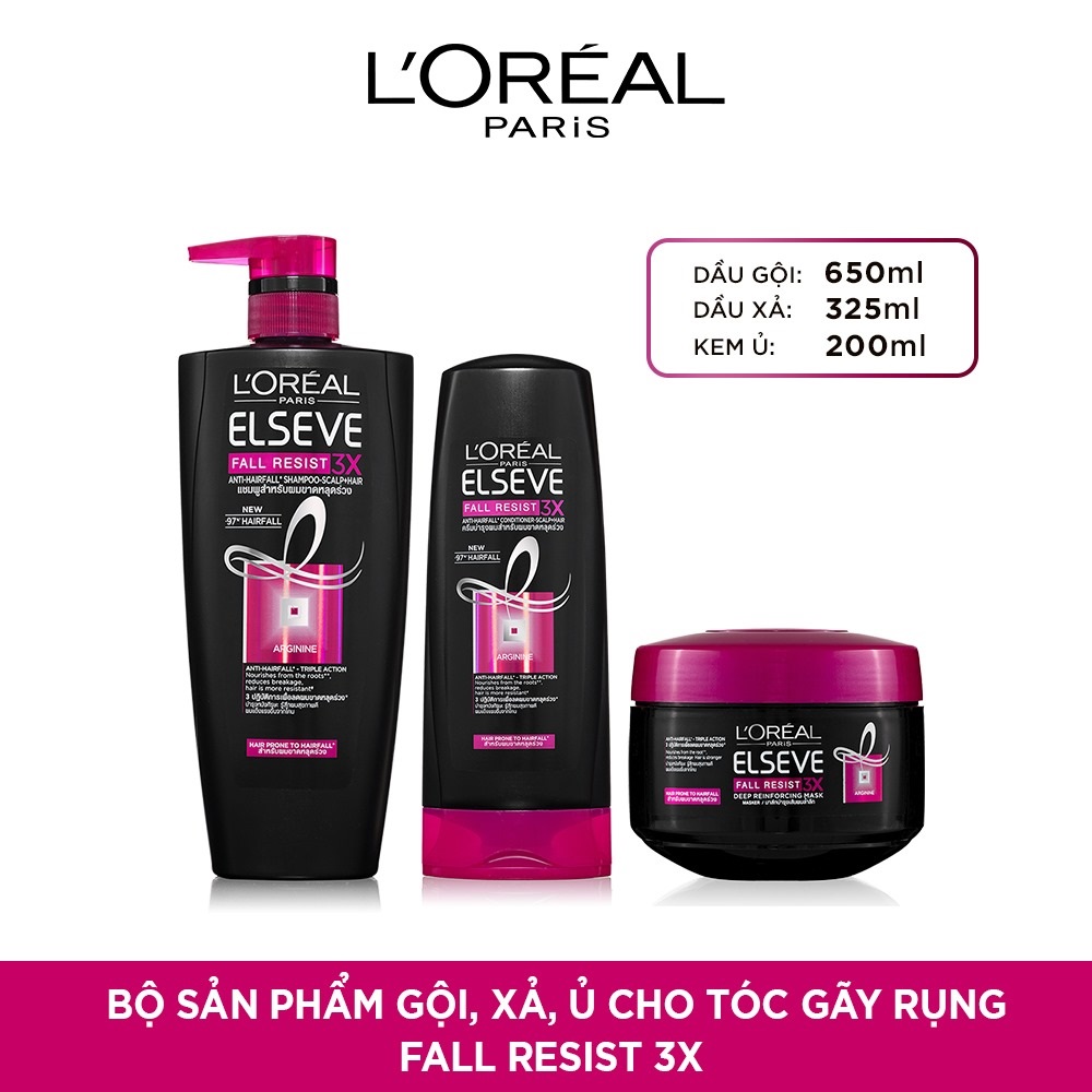 Bộ sản phẩm Bộ chăm sóc tóc ngăn gãy rụng tóc toàn diện L’Oreal Paris Fall Resist 3X, Thương hiệu L’ORÉAL Xuất xứ thương hiệu Pháp Xuất xứ Indonesia Hạn sử dụng 3 năm kể từ ngày sản xuất Loại tóc Mọi loại tóc SKU 7928361003719.