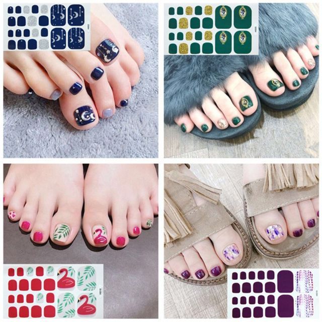 Bộ sản phẩm: Bộ dán móng chân gồm 22 móng sticker, không tróc khi gặp nước, đàn hồi tốt.