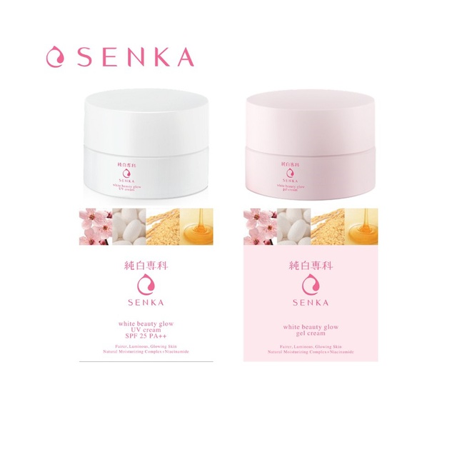 1. Kem dưỡng trắng da chống nắng ban ngày Senka White Beauty Glow UV Cream SPF 25 PA ++ 50g Giúp giảm sạm nám thâm mụn và tàn nhang, da không đồng màu , đồng thời chống nắng, bảo vệ da khỏi tác hại của tia UV mang lại làn da mềm mịn, trắng sáng, trong mướt. Đồng thời sản phẩm được chiết xuất từ các nguyên liệu tự nhiên như tinh chất hoa anh đào, tơ tằm trắng, cám gạo, mật ong và gấp đôi thành phần dưỡng ẩm Hyaluronic Acid chính là lựa chọn tối ưu cho làn da luôn tươi trẻ, mịn màng. Bên cạnh đó, kem dưỡng trắng da chống nắng ban ngày Senka White Beauty Glow UV Cream SPF 25 PA ++ 50g còn có công dụng chống nắng, bảo vệ da tối ưu khỏi các tác hại từ ánh nắng mặt trời, tuyệt đối an toàn cho mọi loại da, kể cả da nhạy cảm. ○ Công nghệ độc quyền và tiên tiến nhất “Natu-Ence” từ Shiseido giúp nâng cao hiệu quả của các dưỡng chất từ thiên nhiên ○ Chiết xuất từ tinh chất Hoa Anh Đào, Tơ Tằm Trắng, Cám Gạo, Mật Ong, gấp đôi thành phần dưỡng ẩm Hyaluronic Acid ○ Đã được kiểm chứng bởi bác sĩ da liễu Kem dưỡng trắng da ban ngày giúp giảm sạm nám thâm mụn và tàn nhang, da không đồng màu , đồng thời chống nắng, bảo vệ da khỏi tác hại của tia UV mang lại làn da mềm mịn, trắng sáng, trong mướt. 2. Kem dưỡng trắng da ban đêm Senka White Beauty Glow Gel Cream 50g Giúp giảm thâm nám, sạm màu và tàn nhang trên da, cung cấp dưỡng chất và giữ ẩm mang lại làn da mềm mịn, trắng sáng, trong mướt. Với công nghệ độc quyền và tiên tiến “Natu-Ence” từ Shiseido giúp nâng cao hiệu quả của các dưỡng chất từ thiên nhiên, Senka White Beauty Glow Gel Cream sẽ bổ sung các dưỡng chất cần thiết và độ ẩm cho làn da luôn mịn màng, trắng sáng. Chỉ sau một thời gian sử dụng làn da của bạn sẽ có những thay đổi rõ rệt, các đốm sạm màu, tàn nhang và thâm nám cũng dần biến mất. Sản phẩm được chiết xuất hoàn toàn từ các nguyên liệu tự nhiên như tinh chất hoa anh đào, tơ tằm trắng, cám gạo, mật ong, tăng dưỡng ẩm Hyaluronic Acid. ○ Công nghệ độc quyền và tiên tiến nhất “Natu-Ence” từ Shiseido giúp nâng cao hiệu quả của các dưỡng chất từ thiên nhiên ○ Chiết xuất từ tinh chất Hoa Anh Đào, Tơ Tằm Trắng, Cám Gạo, Mật Ong, gấp đôi thành phần dưỡng ẩm Hyaluronic Acid ○ Không chất tạo màu. Đã được kiểm chứng bởi bác sĩ da liễu. Hướng dẫn sử dụng -Sau khi sử dung lotion/nước làm mềm da, lấy một lượng sản phẩm vừa đủ và thoa đều khắp mặt và cổ. Sử dụng mỗi buổi sáng/tối sẽ giúp giúp cung cấp dưỡng chất cho làn da mộc khỏe đẹp, mềm mại và trắng sáng. -Tránh sử dụng trên các vết thương hở hoặc vùng da đang bị tổn thương. Ngưng sử dụng nếu xảy ra kích ứng. Đặt xa tầm tay trẻ em. -Phù hợp mọi loại da. Hướng dẫn bảo quản -Tránh để nơi nhiệt độ cao hoặc tiếp xúc trực tiếp với ánh nắng mặt trời. -Cần duy trì bảo quản trong tủ lạnh sau khi mở nắp nếu sản phẩm được bảo quản lạnh lúc đầu. Nơi thoáng mát, tránh ánh nắng trực tiếp. Nơi sản xuất: Việt Nam Tiêu Chuẩn Chất Lượng Nhật Bản. Xuất xứ thương hiệu: Nhật Bản. Hạn sử dụng: 3 năm kể từ ngày sản xuất. Ngày sản xuất: Xem trên bao bì sản