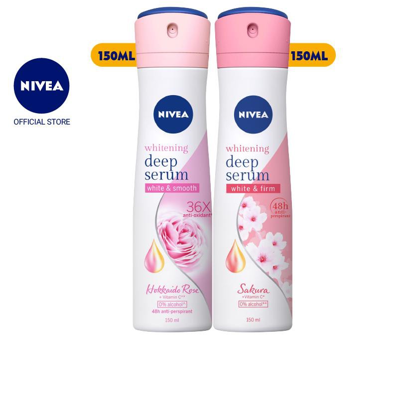 Bộ sản phẩm: Bộ đôi Xịt serum ngăn mùi NIVEA dưỡng trắng hương hoa hồng Hokkaido & Sakura (150ml x2).