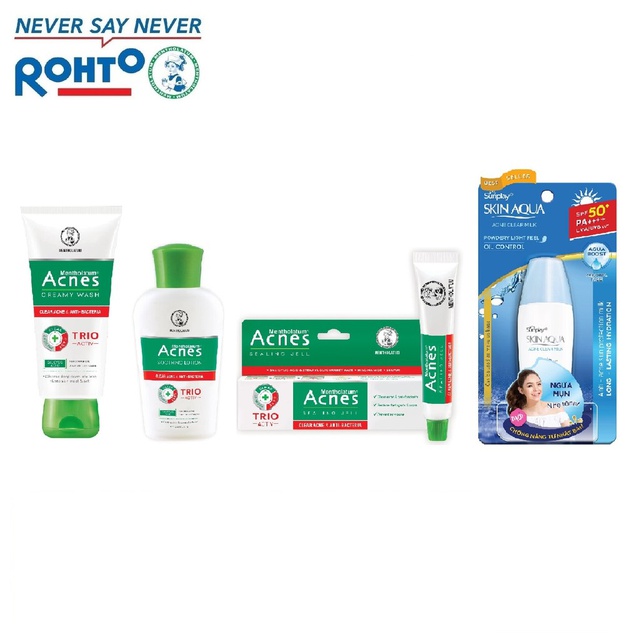 Bộ sản phẩm chống nắng ngừa mụn Sunplay – Acnes (Sữa chống nắng 25g + Kem rửa mặt 100g + Dung dịch 90ml + Gel ngừa mụn 18g) Bộ sản phẩm chống nắng ngừa mụn Sunplay – Acnes gồm 4 sản phẩm đến từ thương hiệu Sunplay và Acnes giúp da chống nắng toàn diện và ngăn ngừa, đồng thời cải thiện các vấn đề về mụn của da. 1. Sữa chống nắng dưỡng da ngừa mụn Sunplay Skin Aqua Acne Clear SPF 50+ PA++++ 25g: – Công thức đặc chế giúp bảo vệ và chăm sóc da dầu, da bị mụn dưới ánh nắng mặt trời. – Chống nắng với SPF 50+, PA++++: Bảo vệ da khỏi tác hại của tia UV, tránh nguy cơ ung thư da – Đặc chế cho da dầu và da bị mụn: Isopropylmethylphenol kháng khuẩn, ức chế sự hình thành mụn. Stearyl Glycyrrhetinate giảm viêm, hỗ trợ cải thiện tình trạng mụn hiệu quả. – Dưỡng da: Dẫn xuất Vitamin C, Vitamin E chống oxi hóa, làm mềm da, giúp da sáng mịn màng, khỏe đẹp. – Tính kháng nước và mồ hôi cao. – Sản phẩm dành riêng cho mặt, dùng hàng ngày. – Có thể dùng làm lớp lót trang điểm. – Cảm giác thoáng mịn nhẹ tênh: Dạng sữa thấm nhanh, không gây nhờn rít, dịu nhẹ và an toàn với vùng da mặt mỏng manh, nhạy cảm. Hướng dẫn sử dụng: Lắc kỹ trước khi dùng. Thoa đều sản phẩm lên da trước khi ra nắng. Nên dùng hàng ngày để da được bảo vệ hiệu quả nhất. Sau khi ra mồ hôi nhiều, thoa lại để có hiệu quả tốt hơn. 2. Kem rửa mặt ngăn ngừa mụn Acnes Creamy Wash 100g: Sản phẩm MENTHOLATUM ACNES với công thức đột phá TRIO-ACTIV mang lại hiệu quả chăm sóc da mụn toàn diện. – SALICYLIC ACID: Rửa sạch chất nhờn dư, tế bào chết và bụi bẩn tận sâu lỗ chân lông. Giúp da sạch thoáng, giảm mụn. – NIACINAMIDE: Hỗ trợ quá trình tái tạo da. Giúp hạn chế sẹo – thâm, giúp da mịn màng. – ZINC GLUCONATE: Kiểm soát chất nhờn dư, kháng khuẩn mụn. Ngăn ngừa hình thành mụn mới. Hướng dẫn sử dụng: – Làm ướt mặt. Lấy một lượng kem vừa đủ vào lòng bàn tay, tạo bọt và thoa đều khắp mặt. Rửa sạch với nhiều nước. * Nên sử dụng kết hợp với Acnes Soothing Lotion và Acnes Sealing Jell để đạt hiệu quả tối ưu. * Phù hợp cho da khô, da thường. * Rửa mặt hàng ngày giúp ngăn ngừa mụn. 3. Dung dịch dịu da kháng khuẩn Acnes Soothing Lotion 90ml Sản phẩm MENTHOLATUM ACNES với công thức đột phá TRIO-ACTIV mang lại hiệu quả chăm sóc da mụn toàn diện. – SALICYLIC ACID: Rửa sạch chất nhờn dư, tế bào chết và bụi bẩn tận sâu lỗ chân lông. Giúp da sạch thoáng, giảm mụn. – NIACINAMIDE: Hỗ trợ quá trình tái tạo da. Giúp hạn chế sẹo – thâm, giúp da mịn màng. – ZINC GLUCONATE: Kiểm soát chất nhờn dư, kháng khuẩn mụn. Ngăn ngừa hình thành mụn mới. *Dung dịch giúp da sạch thoáng để hấp thu tốt thành phần của Gel sạch mụn & kháng khuẩn Acnes Sealing Jell. Hướng dẫn sử dụng: – Sau khi rửa mặt sạch, lấy một lượng dung dịch vừa đủ vào lòng bàn tay, vỗ nhẹ đều khắp mặt. Không rửa lại với nước. *Nên sử dụng kết hợp với Acnes Creamy Wash hoặc Acnes Foaming Wash và Acnes Sealing Jell để đạt hiệu quả tối ưu. 4. Gel ngừa mụn kháng khuẩn Acnes Sealing Jell 18g: – SALICYLIC ACID (2%) & STEARYL GLYCYRRHETINATE: Làm dịu da và khô nhân mụn, giúp nhân mụn thoát ra dễ dàng. Kháng khuẩn, ngăn ngừa sự phát triển của vi khuẩn gây mụn P.Acnes. Giúp làm sạch mụn đầu đen, đầu trắng. – NIACINAMIDE: Hỗ trợ quá trình tái tạo da. Giúp hạn chế sẹo – thâm, giúp da mịn màng. – SULFUR (3%): Làm mềm và tróc lớp sừng, thông thoáng lỗ chân lông. Ngăn ngừa hình thành mụn mới. * ACNES SEALING JELL ĐƯỢC KHUYÊN DÙNG CHO MỤN ĐẦU TRẮNG, MỤN ĐẦU ĐEN. Hướng dẫn sử dụng: – Chấm một lượng gel vừa đủ vào đầu ngón tay và thoa đều lên vùng da bị mụn. *Nên sử dụng kết hợp với Acnes Creamy Wash hoặc Acnes Foaming Wash và Acnes Soothing Lotion để đạt hiệu quả tối ưu. *Được khuyên dùng cho mụn đầu trắng, mụn đầu đen. 5. Thông tin thương hiệu: + Thương hiệu Sunplay và Acnes thuộc công ty Rohto-Mentholatum (Việt Nam) + Xuất sứ thương hiệu: Nhật Bản + Nơi sản xuất: Việt Nam + Hạn sử dụng: 3 năm kể từ ngày sản xuất + Ngày sản xuất: Xem chi tiết trên bao bì #acnes #sunplay