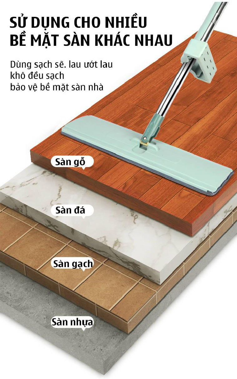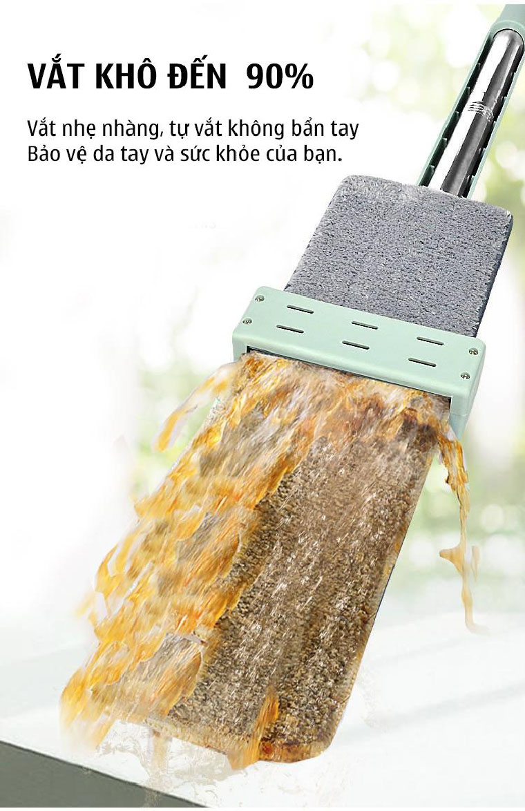Cây lau nhà Kitimop-X với thiết kế thông minh, chức năng tự vắt khô nước mà không cần động tay vào, vắt nước khô đến 95% sạch sẽ, bảo vệ sức khỏe. Bàn lau hình chữ nhật kích thước 38x12cm xoay 360 độ dùng lau nhà nhanh sạch, lau gầm tủ ghế, khe góc nhà tiện lợi, không tốn sức. ——————– Thông tin về chổi lau nhà Kitimop-X 1 hộp bao gồm: 1 cây lau nhà Kitimop-X + 1 miếng giẻ thay thế + 1 phiếu hướng dẫn sử dụng. – Cây lau sàn phẳng, chất liệu inox + nhựa. Cán dài 1,25m , bàn lau kích thước: 38×12 (cm) – Miếng giẻ vải vi sợi microfiber thay thế. – Màu sắc: Màu xanh ngọc Ưu điểm nổi bật của sản phẩm: – Cây lau nhà gọn nhẹ, đa năng. Sau khi dùng xong có thể gấp gọn lại được – Xoay 360 độ linh hoạt lau nhanh hơn, dễ dàng hơn. Lau được gầm tủ, gầm ghế dễ dàng. – Giẻ lau nhà làm từ sợi vải tĩnh điện Microfiber, hút bẩn cả khô cả nước rất tốt. – Có con năn trợ lực khi vắt, vắt nhẹ nhàng êm ái hơn – Có răng lược ở đầu vắt, vắt khô và sạch hơn. – Thiết kế chỉ cần kéo lên kéo xuống nhẹ nhàng là vắt khô. – Quan trọng nhất là không cần động tay vào nước mà vẫn có thể lau nhà sạch bóng. Sản phẩm còn có thể dùng lau, quét trần nhà, lau kính hay các thiết bị được lắp đặt trên cao. – Lưu ý: Cây lau sàn Kitimop-X tự vắt không kèm thùng đựng nước.