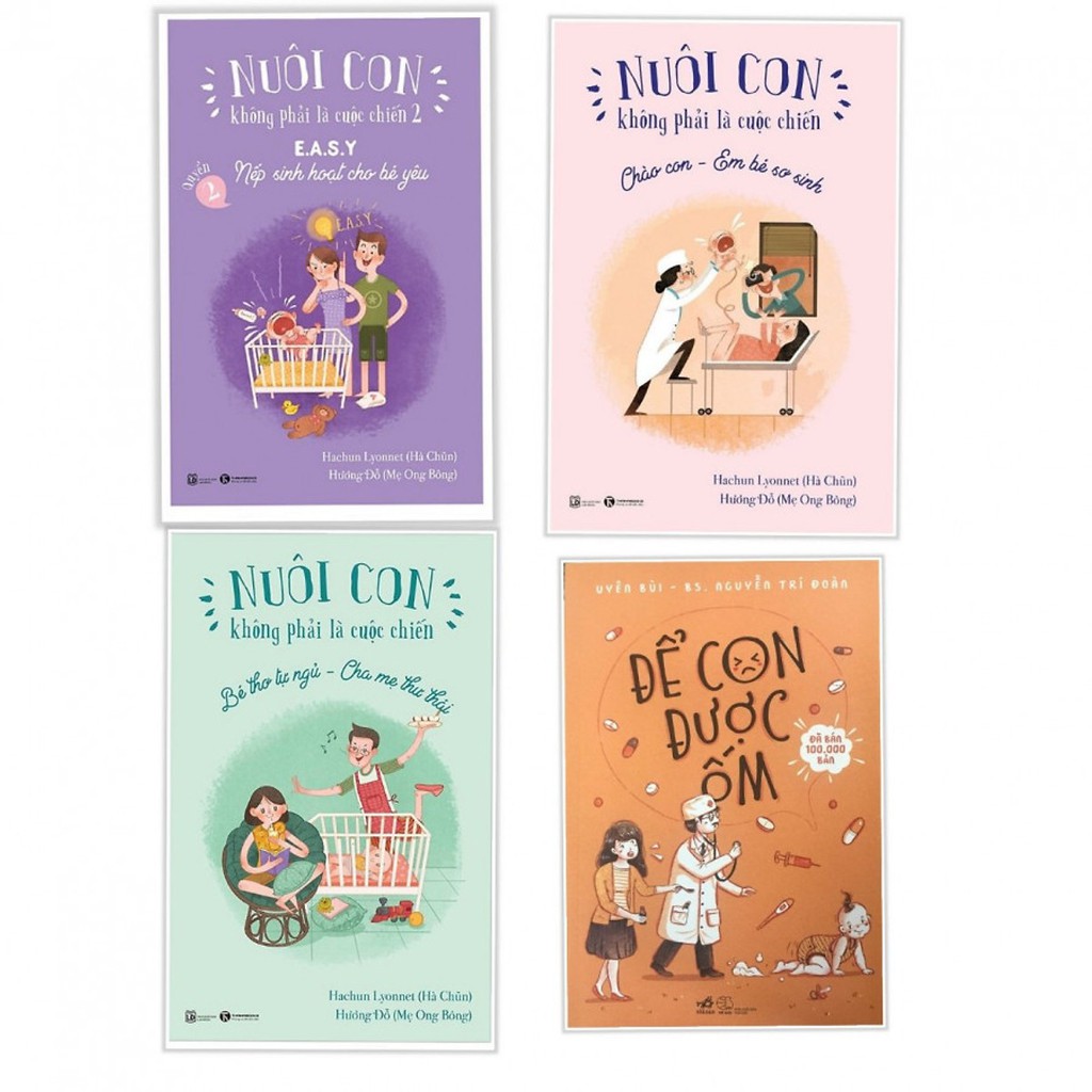 1/Để Con Được Ốm Để con được ốm có thể coi là một cuốn nhật ký học làm mẹ thông qua những câu chuyện từ trải nghiệm thực tế mà chị Uyên Bùi đã trải qua từ khi mang thai đến khi em bé chào đời và trở thành một cô bé khỏe mạnh, vui vẻ. Cùng với những câu chuyện nhỏ thú vị của người mẹ là lời khuyên mang tính chuyên môn, giải đáp cụ thể từ bác sỹ Nguyễn Trí Đoàn, giúp hóa giải những hiểu lầm từ kinh nghiệm dân gian được truyền lại, cũng như lý giải một cách khoa học những thông tin chưa đúng đắn đang được lưu truyền hiện nay, mang đến góc nhìn đúng đắn nhất cho mỗi hiện tượng, sự việc với những kiến thức y khoa hiện đại được cập nhật liên tục. Công ty phát hành Nhã Nam Tác giả Uyên Bùi – BS. Trí Đoàn Ngày xuất bản 03-2018 Kích thước 14 x 20.5 cm Nhà xuất bản Nhà Xuất Bản Thế Giới Loại bìa Bìa mềm Số trang 300 2/Cuốn 1: EM BÉ SƠ SINH CHÀO ĐỜI – Khoa học về bữa ăn và giấc ngủ của bé thơ. Bao gồm những kiến thức chung cha mẹ cần biết về trẻ từ lúc sơ sinh, giúp cha mẹ khởi động kỹ năng quan sát, lắng nghe và kết nối với con mình. Làm cha me thông thái bắt đầu từ những hiểu biết khoa học là đây. Cuốn 2: EASY – Chìa khóa của cha mẹ thông thái. Đây là nội dung chủ điểm của bộ sách, trong đó nhóm tác giả đi sâu vào giải quyết nhiều vấn đề lớn nhỏ của những mốc độ tuổi khác nhau: từ những khủng hoảng ngủ cho đến những vấn đề sợ xa cách, bám mẹ… Nhóm tác giả cũng gợi ý nhiều giải pháp cho vấn đề ngủ ngắn, khuyến khích bé ngủ qua đêm hay vấn đề ăn thiếu hiệu quả. EASY chính là trọng tâm để tạo nên sự tin tưởng và kết nối cùng phát triển giữa em bé và những ngƣời xung quanh mình. Cuốn 3: BÉ THƠ TỰ NGỦ – Cha mẹ thư thái. Em bé tự ngủ là một trong những chủ đề nhạy cảm mà bấy lâu nay tuy đƣợc áp dụng rất phổ biến tại phƣơng tây nhƣng còn khá xa lạ với các bậc cha mẹ Việt. Em bé tự ngủ hầu như là không thể trong quan niệm của cha mẹ Việt, nhƣng một thực tế ngày càng đƣợc hình thành và khẳng định rằng một khi những em bé biết tự ngủ, ngủ tự lập mà không cần sự hỗ trợ (ti mẹ, ru ẵm…) có nhiều cơ hội hơn để ngủ đủ theo nhu cầu của mình. Tên Nhà Cung Cấp Thai Ha Books Tác giả Hachun Lyonnet, Hương Đỗ NXB NXB Lao Động Năm XB 2018 Kích thước (cm) 15.5 x 24 #nuoiconkhongphaicuocchien#nuoidaycon#sach#deconduocom