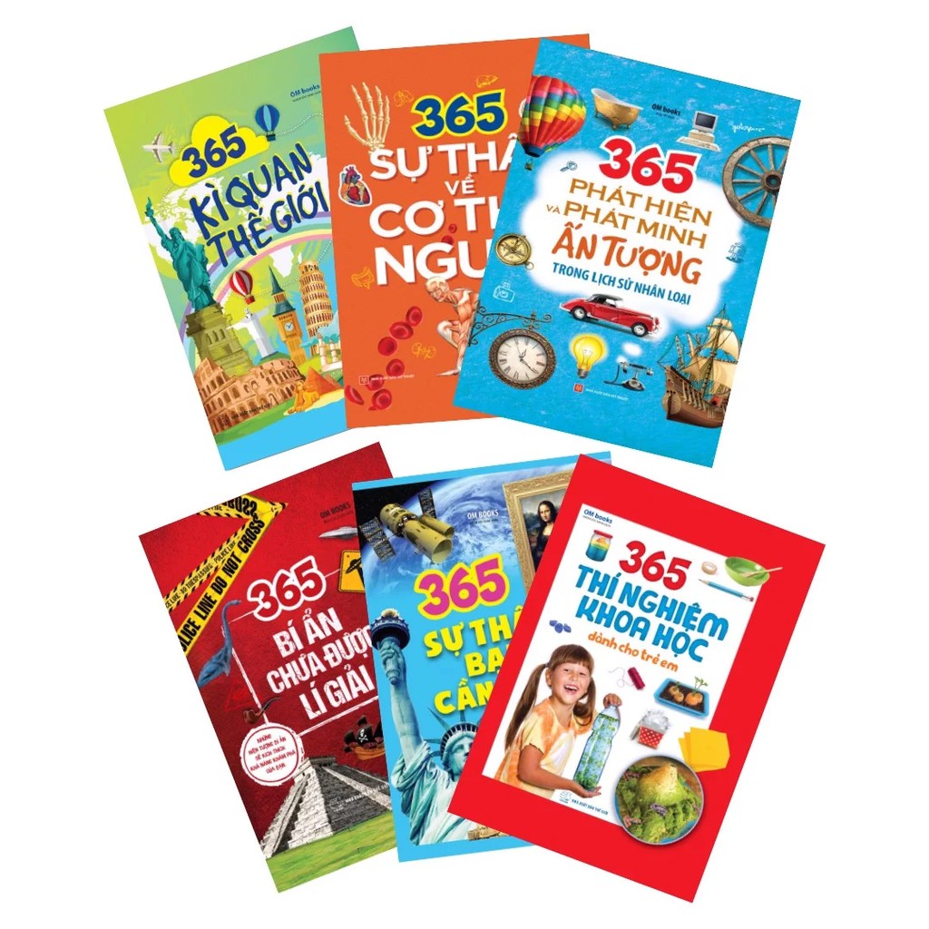 COMBO SÁCH: CÙNG CON KHÁM PHÁ THẾ GIỚI Mã sản phẩm: 8936061050 Tác giả : OM Books Dịch giả :Nhiều dịch giả Nhà xuất bản: Thế giới Kích thước : 19x27cm Năm xuất bản : 2019 Số trang : 1423 Khối lượng : 7320 grams Bìa : Cứng Tại Sao Đây Là Bộ Sách Mà Các Con Nhất Định Cần Sở Hữu? Bộ sách bao gồm tất cả những kiến thức trong cuộc sống và học tập, hình thức của những cuốn sách màu sắc phong phú, giúp con kết hợp giữa học mà chơi – chơi mà học tạo nên sự hứng thú khi học tập cho các con. 1. 365 kì quan thế giới Bạn có biết? Việc xây dựng đền Tạ Mahal mất đến 22 năm (từ 1632 – 1653) và cần tới 20.000 nghệ nhân đến từ nhiều vùng miền khác nhau. Hay rạn san hô Great Barrier là vật thể sống duy nhất trên Trái Đất có thể nhìn thấy từ vũ trụ,… Và con vô vàn điều trên thế giới cần các bạn khám phá! 365 kì quan thế giới như những chuyến bay đưa con đến mọi miền của thế giới qua trang sách. Qua mỗi chuyến bay con lại khám phá được nhiều điều mới mẻ hơn. Chắc chắn rằng đây là cuốn sách không thể thiếu đối với các con! 2. 365 sự thật bạn cần biết Trái Đất quay quanh Mặt Trời với tốc độ bao nhiêu? Môn thể thao quốc gia Thổ Nhĩ Kì là gì? Gối được phát minh ra từ khi nào? Thế giới đầy ắp những câu chuyện kì lạ và những sự thật thú vị mà cõ lẽ bạn chưa biết đến. Vì vậy mà cuốn sách này chính là món quà mà chúng tôi dành tặng cho bạn, có rất nhiều bí mật thú vị khác về các chủ đề trong cuộc sống sẽ được kể lại trong cuốn sách. Qua từng trang sách, bạn sẽ đi từ bất ngờ này đến bất ngờ khác, và tri thức của bạn sẽ được tăng lên gấp bội. Hãy mở sách ra và sửng sốt với những điều vô cùng mới mẻ, kì lạ nào! 3. 365 Bí ẩn chưa được lí giải Cũng là những tri thức, nhưng chúng không cứng nhắc và khô khan như chúng ta vẫn thường thấy. Người đọc sẽ nhanh chóng bị lôi cuốn vào một thế giới đầy bí ẩn, nơi đó, chúng ta như được đối thoại cùng những người nổi tiếng. Chúng ta sẽ được tìm hiểu về họ, đối thoại cùng họ, và…. từ lúc nào, chúng ta đã thu nhận được những tri thức vô cùng thú vị. Bạn sẽ được tìm hiểu về cuộc sống,sở thích và các bí mật nho nhỏ chưa bao giờ được công bố của các bí ẩn chưa được lí giải trên thế giới thông qua những câu chuyện thú vị và những bức tranh sinh động. Sau mỗi câu chuyện bí ẩn sẽ là một kiến thức hữu ích . 4. 365 sự thật về cơ thể người Bạn có biết cơ thể chúng ta được tạo nên từ bụi sao không? Mọi thứ trong cơ thể chúng ta đều từng là một phần của những ngôi sao khổng lồ bị sụp đổ và cả Trái Đất cũng vậy. Biết được điều này chúng ta sẽ không thấy ngạc nhiên khi cơ thể mình lại có cấu tạo tuyệt vời đến vậy. Vẫn còn mổ số bí ẩn kì lạ về cơ thể người mà chúng ta chưa khám phá ra. Bên cạnh đó, cuốn sách cung cấp những kiến thức toàn diện về cơ thể theo các chương như về não bộ, hệ tuần hoàn, hệ hô hấp, hệ cơ,… Biết đâu đấy, chính bạn sẽ khám phá ra một số bí mật kì diệu về cơ thể người thì sao! 5. 365 phát hiện và phát minh ấn tượng trong lịch sử nhân loại Từ thời tiền sử đến nay, nền văn minh nhân loại đã có những bước phát triển vĩ đại. Trong số vô vàn những phát hiện và phát minh, có những thứ đã vĩnh viễn thay đổi cuộc sống của chúng ta. Cuốn sách viết về sự ra đời của những đồ vật xung quanh cuộc sống hàng ngày của con người, gồm tất cả các chủ đề như đồ ăn, đồ vật trong nhà, trang phục tới các phương tiện,…. Chắc chắn, đây sẽ là cuốn sách ý nghĩa trên hành trình chinh phục kiến thức! 6. 365 thí nghiệm khoa học dành cho trẻ Cuốn sách trình bày về các thí nghiệm khoa học theo các mức độ từ dễ đến khó, các thí nghiệm được thể hiện trong những trang sách bắt mắt, đơn giản. Đặc biệt, các thí nghiệm được chia theo các chương, sau từng thí nghiệm là phần giải thích rất dễ hiểu giúp bé dễ dàng nâng cao được kiến thức và hiểu biết của mình. Thực ra, con thông minh, nhạy bén với thế giới bên ngoài hay không phụ thuộc rất lớn vào việc giáo dục của cha mẹ. Dạy con trẻ có nhiều khó khăn nhưng đây cũng được coi là độ tuổi vàng để cung cấp cho con những kiến thức, kĩ năng mới!