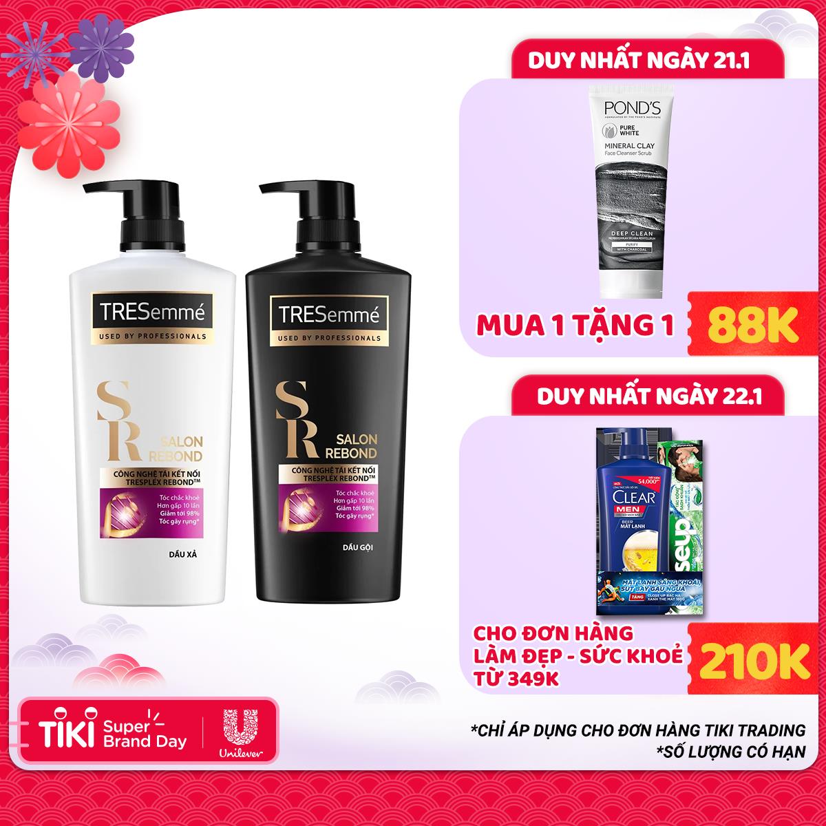 Bộ sản phẩm Combo Dầu Gội 640gr Và Dầu Xả 620gr Tresemmé Salon Rebond Công Nghệ Tái Kết Nối Ngăn Ngừa Gãy Rụng của thương hiệu: TRESemmé trong lĩnh vực: Làm đẹp – Sức khỏe có giá ưu đãi chỉ: 294.500 ₫, được xếp hạng: Đứng thứ 4 trong Top 1000 Bộ dầu gội, xả bán chạy tháng này, đi kèm với hơn: 157 nhận xét, đánh giá từ khách hàng.