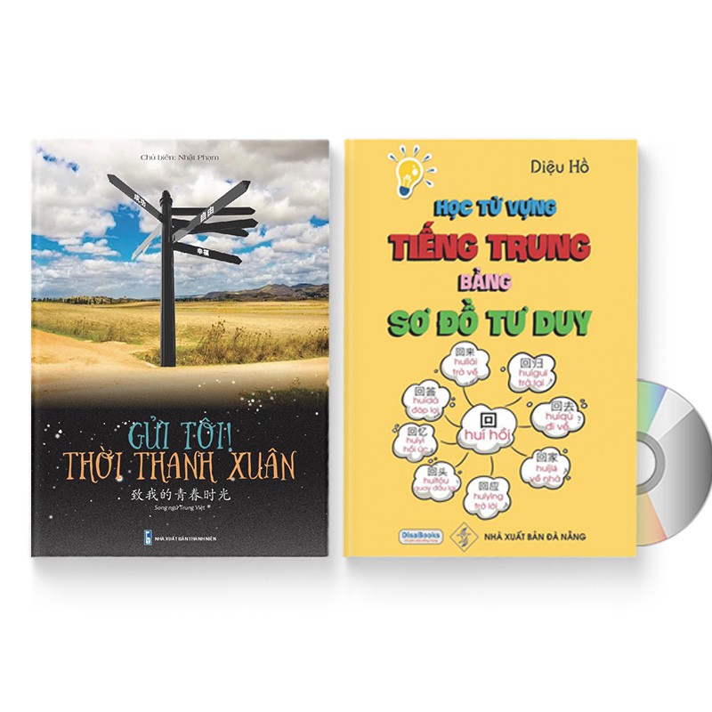 Sách – Combo: Gửi Tôi Thời Thanh Xuân + Học từ vựng tiếng Trung bằng sơ đồ tư duy + DVD quà tặng Gửi Tôi Thời Thanh Xuân (Trung – Pinyin – Việt, Có Audio nghe sách) Chủ biên: Nhật Phạm Năm xuất bản: 2021 Nhà xuất bản: Thanh Niên Số trang: 403 Giá bìa: 320,000 VNĐ Nội dung sách: Gồm hơn 500 câu song ngữ (Trung – Việt – Pinyin) về những kỷ niệm, bâng khuâng, hoài nhớ về thanh xuân của mỗi người Giữa những năm tháng thanh xuân của cuộc đời, có người đắm chìm trong hạnh phúc, có người trượt dài trong vô vọng, ấy thế nhưng đôi khi gặp phải một người bạn tốt nắm tay ta bước những ngã tư của cuộc đời khốc liệt, tự thấy rằng, đời thật may mắn. Và mong rằng, cuốn sách dành cho tâm hồn tuổi thanh xuân này, sẽ trở thành bằng hữu chân tình của các bạn, những người đang hoài nghi về thanh xuân! Học từ vựng tiếng Trung bằng sơ đồ tư duy Tác giả: Diệu Hồ Số trang: 308 Năm xuất bản: 2019 Nhà xuất Bản: Đà Nẵng Giá bìa: 300000 VNĐ Nội dung sách: Cuốn sách mang sứ mệnh giúp người học sau khi đã làm quen với chữ Hán, có thể nhanh chóng tiếp cận với nguồn từ ghép của các chữ Hán