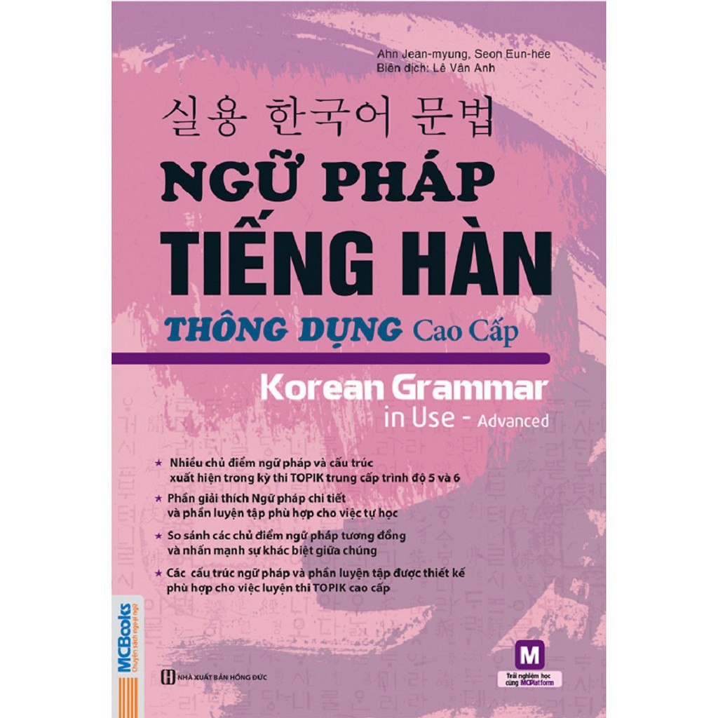 1. Ngữ Pháp Tiếng Hàn Thông Dụng – Trung Cấp Công ty phát hành MCBOOKS Tác giả Nhiều tác giả Nhà xuất bản Hồng Đức Năm xuất bản 2020 Số trang 432 GIới thiệu sách Cuốn sách “Ngữ pháp tiếng Hàn thông dụng – Korean Grammar in use” tổng hợp những phần ngữ pháp thường xuất hiện trong các giáo trình Trung cấp 3-4 thường được sử dụng tại các Trung tâm ngôn ngữ thuộc các trường Đại học ở Hàn Quốc, rất phù hợp những học sinh đã biết tiếng Hàn và muốn tổng hợp lại những kiến thức mà mình đã học. Trình độ trung cấp với nhiều chủ điểm ngữ pháp khó, những cuốn giáo trình ngữ pháp tiếng Hàn cơ bản không không đề cập đến hoặc có đề cập nhưng không giải thích chi tiết. Các bạn có học nhưng không thể nắm được cách sử dụng chúng thành thạo. Bên cạnh đó trình độ trung cấp có nhiều chủ điểm ngữ pháp tương đồng, dễ gây nhầm lẫn cho người học. Các bạn muốn tìm cuốn sách giải thích cặn kẽ sự khác nhau giữa các cấu trúc này nhưng lại không hề dễ dàng. 2. Ngữ Pháp Tiếng Hàn Thông Dụng – Cao Cấp Công ty phát hành MCBOOKS Tác giả Nhiều tác giả Nhà xuất bản Hồng Đức Năm xuất bản 2020 Số trang 408 Giới thiệu sách Nằm trong bộ sách Ngữ pháp tiếng Hàn nằm trong top sách được yêu thích nhất năm 2017, cuốn sách Ngữ pháp tiếng Hàn thông dụng Cao cấp là cuốn sách thứ 3 của bộ sách này, bổ sung những kiến thức ở cấp độ cao hơn cho người đọc. Cuốn sách bao gồm 22 chủ điểm ngữ pháp xuất hiện nhiều trong các kỳ thi năng lực tiếng Hàn giúp người học có thể tổng hợp kiến thức và tiếp cận gần nhất với các kỳ thi. Với hai cuốn sách Ngữ pháp tiếng Hàn thông dụng sơ cấp và Ngữ pháp tiếng Hàn thông dụng trung cấp đã cung cấp những chủ điểm ngữ pháp theo đúng trình độ cho người học. Còn đối với cuốn sách Ngữ pháp tiếng Hàn thông dụng cao cấp, bạn học sẽ được giới thiệu những chuyên đề ngữ pháp chuyên sâu theo tiêu chuẩn cao cấp.