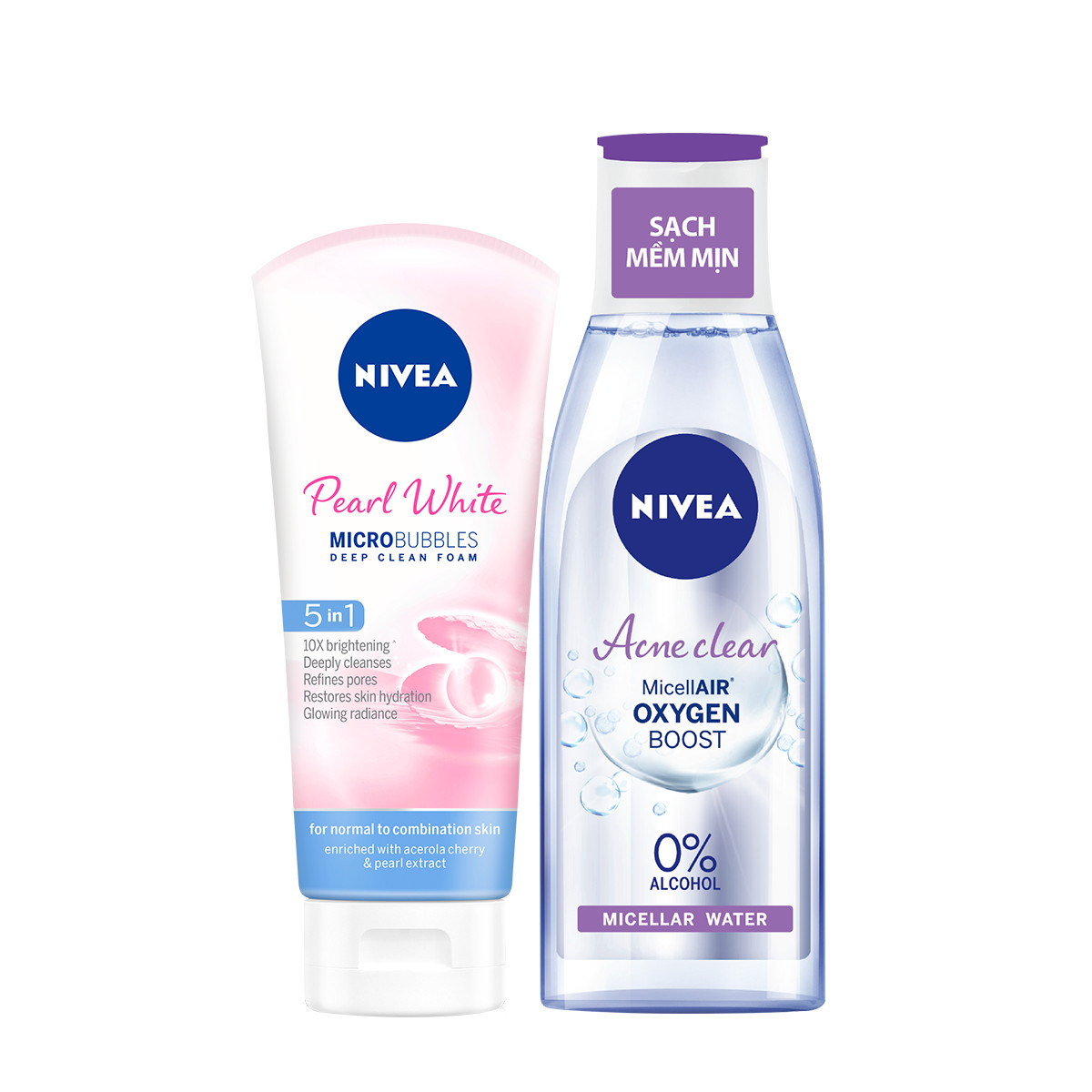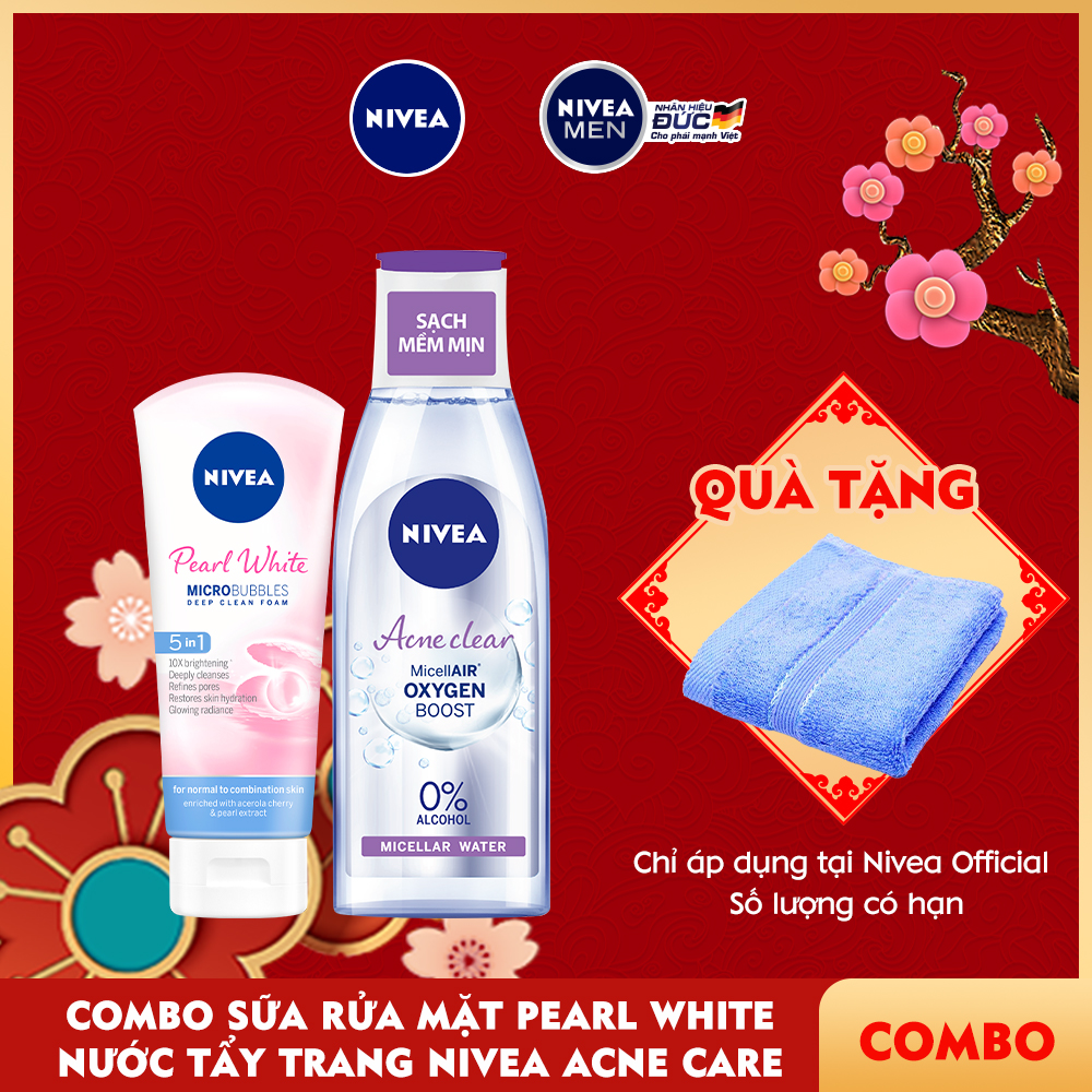 Bộ đôi làm sạch sâu kết hợp mang lại hiệu quả tức thì Sữa rửa mặt giúp trắng da ngọc trai mang đến hiệu quả sạch sâu tích hợp cho tác dụng dưỡng trắng da gấp 10 lần. Nước tẩy trang dịu nhẹ giúp sạch khuẩn, giảm viêm mụn Công thức an toàn không gây khô da, giữ da mềm mịn Không chứa cồn, paraben và dầu khoáng. SỮA RỬA MẶT NIVEA PEARL WHITE GIÚP TRẮNG DA (100G) Sữa rửa mặt giúp trắng da ngọc trai phát triển dựa trên công thức làm sạch cho mọi loại da, mang đến hiệu quả sạch sâu* & tinh chất Pearly White** tích hợp cho tác dụng dưỡng trắng da gấp 10 lần. Tinh chất Pearly White: Cung cấp khả năng dưỡng trắng da gấp 10 lần** so với Vitamin C. Công nghệ bọt siêu nhỏ: Làm sạch sâu hiệu quả mọi bụi bẩn bã nhờn mà không cần chà xát mạnh trên da. Sữa rửa mặt giúp trắng da ngọc trai phát triển dựa trên công thức làm sạch cho mọi loại da, mang đến hiệu quả sạch sâu* & tinh chất Pearly White** tích hợp cho tác dụng dưỡng trắng da gấp 10 lần. An toàn dịu nhẹ cho da. * Ở tầng biểu bì ** Hiệu quả từ thành phần 4-butylresorcinol so với Vitamin C, theo kết quả phòng thí nghiệm thực hiện bởi Beiersdorf AG, Hamburg, Đức, tháng 08/2011. *** Công thức không bổ sung Ethyl Alcohol (Ethanol) Hướng dẫn sử dụng: Làm ướt mặt. Tạo bọt sữa rửa mặt với nước và mát-xa mặt nhẹ nhàng theo chuyển động tròn để dưỡng chất trong sữa rửa mặt có thể thấm sâu vào trong, làm sạch da. Rửa sạch lại bằng nước lạnh để giúp lỗ chân lông se khít. Sử dụng thường xuyên mỗi buổi sáng và tối. – Lưu ý: Để xa tầm tay trẻ em. Tránh tiếp xúc trực tiếp với mắt. Ngưng dùng khi có dấu hiệu kích ứng. NƯỚC TẨY TRANG NGĂN NGỪA MỤN NIVEA ACNE CARE MICELLAR WATER 200ml CHI TIẾT SẢN PHẨM: Làn da sạch sâu, không lo mụn và sạch lớp trang điểm với: – Công thức an toàn & dịu nhẹ : Không bổ sung cồn gây khô da*, paraben, chất tạo mùi, silicone, dầu khoáng. – Lactic acid là chất giúp giảm viêm mụn & kháng khuẩn gây mụn hiệu quả. Glycerin giữ da mềm mịn. – Carnitine là chất giúp giảm tiết nhờn- một trong những nguyên nhân chính gây mụn. *Công thức không chứa Althyl alcohol ( Ethanol) Hướng dẫn sử dụng: + Lắc đều chai, lấy một lượng sản phẩm vừa đủ ra tay hoặc bông cotton và nhẹ nhàng đặt lên vùng mắt hoặc môi khoảng 15 – 20 giây. + Sau đó dùng miếng cotton lau nhẹ nhàng, lặp đi lặp lại cho đến khi không còn lớp trang điểm. – Lưu ý: Để xa tầm tay trẻ em. Tránh tiếp xúc trực tiếp với mắt. Ngưng dùng khi có dấu hiệu kích ứng. – Thương hiệu NIVEA thuộc tập đoàn Beiersdorf – Xuất xứ: Đức – Sản xuất tại: Thái Lan – Hạn sử dụng: 36 tháng từ ngày sản xuất – Thông tin ngày sản xuất: xem chi tiết trên bao bì sản phẩm – Bao bì sản phẩm thay đổi theo từng đợt nhập hàng.