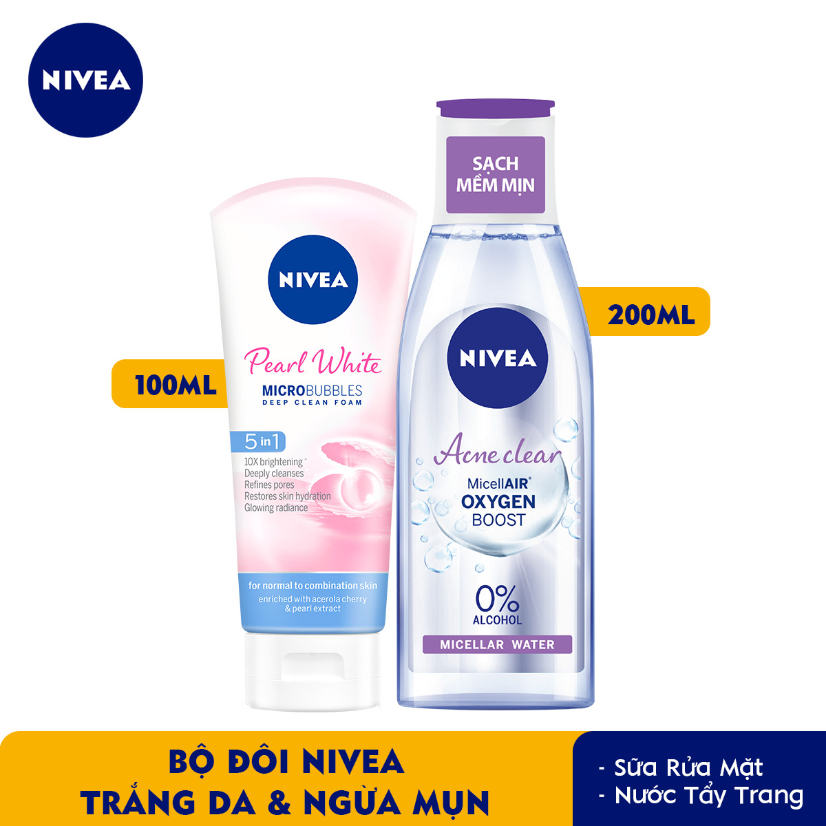 Bộ sản phẩm Combo Sữa rửa mặt NIVEA Pearl White giúp trắng da (100g) – 81295 & Nước tẩy trang NIVEA ngừa mụn Acne Care Micellar Water (200ml) – 89271 Thương hiệu: Nivea.