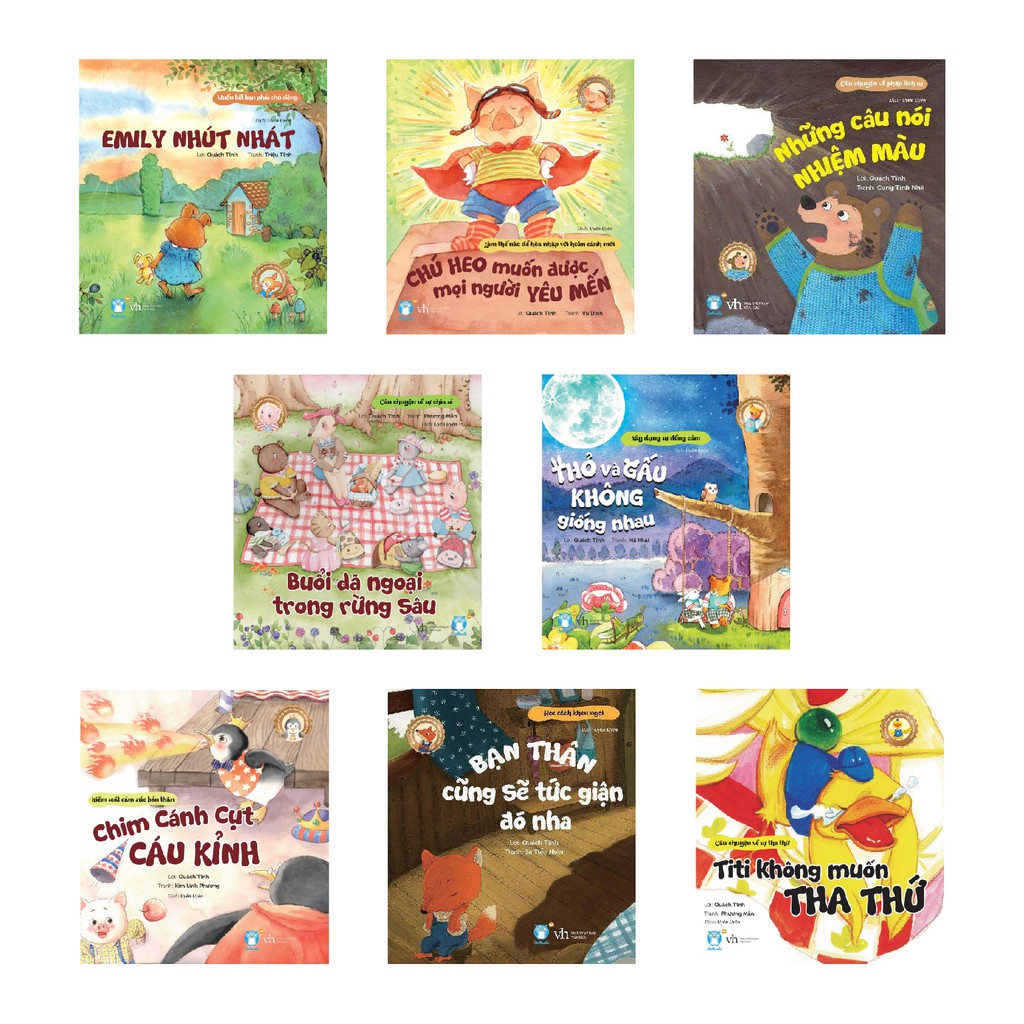 1. TỪ ĐIỂN CỦA QUÁI VẬT Tác giả: Phương Tố Trân NXB: Văn học Đây là bài học “Tôi làm được” trong quá trình trưởng thành, chứa đựng một bí mật nho nhỏ có thể giúp bé vượt qua khó khăn: Dạy bé tích cực suy nghĩ, dám đối mặt với khó khăn, dùng tâm thái lạc quan để giải quyết những vấn đề mình gặp phải. Quái vật Đầu To rất thích nghe người leo núi nói chuyện, một hôm, nó vô tình nghe được một bí quyết, chỉ cần xoá hai chữ “khó khăn” ra khỏi từ điển thì làm việc gì cũng sẽ dễ dàng hơn nhiều. Sau khi nó xoá hai chữ “khó khăn” đi, quả nhiên chuyện thần kì đã xảy ra, đầu óc của quái vật Đầu To “bỗng dưng” biến đổi, nó liên tục nghĩ ra những cách giải quyết vấn đề cực hay. 2. THỎ VÀ GẤU KHÔNG GIỐNG NHAU Lời : Quách Tĩnh Tranh: Mã Khải NXB: Văn học – Owlbooks Khổ sách: 21,5 x 23,5cm __ Sách vỡ lòng cho các bạn nhỏ được yêu mến __ Các bé rời khỏi vòng tay che chở của cha mẹ, bắt đầu tự kết bạn là một cột mốc lớn trong đời! Trong quá trình xây dựng các mối quan hệ cho mình, rất nhiều bé sẽ không kịp thích ứng. Vì khi ở bên cha mẹ, bé luôn được thỏa mãn, được thấu hiểu, nhưng các bạn thì không như thế. Bộ sách này dùng những câu chuyện thú vị để dạy bé cách giao tiếp, cách giải quyết mâu thuẫn, từng bước học cách xử lý quan hệ với mọi người, để trở thành một bạn nhỏ được mọi người yêu mến. 3. CHÚ HEO MUỐN ĐƯỢC MỌI NGƯỜI YÊU MẾN Lời : Quách Tĩnh Tranh: Vu Dĩnh NXB: Văn học – Owlbooks Khổ sách: 21,5 x 23,5cm __ Sách vỡ lòng cho các bạn nhỏ được yêu mến __ Các bé rời khỏi vòng tay che chở của cha mẹ, bắt đầu tự kết bạn là một cột mốc lớn trong đời! Trong quá trình xây dựng các mối quan hệ cho mình, rất nhiều bé sẽ không kịp thích ứng. Vì khi ở bên cha mẹ, bé luôn được thỏa mãn, được thấu hiểu, nhưng các bạn thì không như thế. Bộ sách này dùng những câu chuyện thú vị để dạy bé cách giao tiếp, cách giải quyết mâu thuẫn, từng bước học cách xử lý quan hệ với mọi người, để trở thành một bạn nhỏ được mọi người yêu mến. 4.TITI KHÔNG MUỐN THA THỨ Lời : Quách Tĩnh Tranh: Phương Mẫn NXB: Văn học – Owlbooks Khổ sách: 21,5 x 23,5cm __ Sách vỡ lòng cho các bạn nhỏ được yêu mến __ Các bé rời khỏi vòng tay che chở của cha mẹ, bắt đầu tự kết bạn là một cột mốc lớn trong đời! Trong quá trình xây dựng các mối quan hệ cho mình, rất nhiều bé sẽ không kịp thích ứng. Vì khi ở bên cha mẹ, bé luôn được thỏa mãn, được thấu hiểu, nhưng các bạn thì không như thế. Bộ sách này dùng những câu chuyện thú vị để dạy bé cách giao tiếp, cách giải quyết mâu thuẫn, từng bước học cách xử lý quan hệ với mọi người, để trở thành một bạn nhỏ được mọi người yêu mến. 5.CHIM CÁNH CỤT CÁU KỈNH Lời : Quách Tĩnh Tranh: Kim Linh Phương NXB: Văn học – Owlbooks Khổ sách: 21,5 x 23,5cm __ Sách vỡ lòng cho các bạn nhỏ được yêu mến __ Các bé rời khỏi vòng tay che chở của cha mẹ, bắt đầu tự kết bạn là một cột mốc lớn trong đời! Trong quá trình xây dựng các mối quan hệ cho mình, rất nhiều bé sẽ không kịp thích ứng. Vì khi ở bên cha mẹ, bé luôn được thỏa mãn, được thấu hiểu, nhưng các bạn thì không như thế. Bộ sách này dùng những câu chuyện thú vị để dạy bé cách giao tiếp, cách giải quyết mâu thuẫn, từng bước học cách xử lý quan hệ với mọi người, để trở thành một bạn nhỏ được mọi người yêu mến. 6. EMILY NHÚT NHÁT Lời : Quách Tĩnh Tranh: Triệu Trinh NXB: Văn học – Owlbooks Khổ sách: 21,5 x 23,5cm Các bé rời khỏi vòng tay che chở của cha mẹ, bắt đầu tự kết bạn là một cột mốc lớn trong đời! Trong quá trình xây dựng các mối quan hệ cho mình, rất nhiều bé sẽ không kịp thích ứng. Vì khi ở bên cha mẹ, bé luôn được thỏa mãn, được thấu hiểu, nhưng các bạn thì không như thế. Bộ sách này dùng những câu chuyện thú vị để dạy bé cách giao tiếp, c 7.BUỔI DÃ NGOẠI TRONG RỪNG SÂU Lời : Quách Tĩnh Tranh: Phương Mẫn NXB: Văn học – Owlbooks Khổ sách: 21,5 x 23,5cm NỘI DUNG: __ Sách vỡ lòng cho các bạn nhỏ được yêu mến __ Các bé rời khỏi vòng tay che chở của cha mẹ, bắt đầu tự kết bạn là một cột mốc lớn trong đời! Trong quá trình xây dựng các mối quan hệ cho mình, rất nhiều bé sẽ không kịp thích ứng. Vì khi ở bên cha mẹ, bé luôn được thỏa mãn, được thấu hiểu, nhưng các bạn thì không như thế. Bộ sách này dùng những câu chuyện thú vị để dạ 8.: NHỮNG CÂU NÓI NHIỆM MÀU Lời : Quách Tĩnh Tranh: Cung Tĩnh Nhã NXB: Văn học – Owlbooks Khổ sách: 21,5 x 23,5cm Giá bìa: 36.000 VNĐ __ Sách vỡ lòng cho các bạn nhỏ được yêu mến __ Các bé rời khỏi vòng tay che chở của cha mẹ, bắt đầu tự kết bạn là một cột mốc lớn trong đời! Trong quá trình xây dựng các mối quan hệ cho mình, rất nhiều bé sẽ không kịp thích ứng. Vì khi ở bên cha mẹ, bé luôn được thỏa mãn, được thấu 