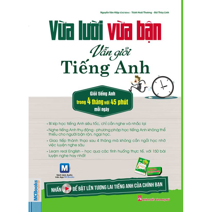 1. Vừa Lười Vừa Bận Vẫn Giỏi Tiếng Anh Công ty phát hành MCBOOKS Tác giả Nguyễn Văn Hiệp Nhà xuất bản Hồng Đức Năm xuất bản 2018 Số trang 371 Giới thiệu sách “Vừa lười vừa bận vẫn giỏi tiếng Anh” là cuốn sách học tiếng Anh theo phương pháp “Nghe tiếng Anh thụ động” hay còn được nhiều bạn gọi với cái tên “tắm ngôn ngữ”, là kiểu bạn cứ bật audio tiếng Anh lên và vẫn làm những việc khác bình thường như nấu cơm, rửa bát, tập thể dục… Các bài học trong cuốn sách này đều là những tình huống thực tế (Learning Real English) nên rất tiện dụng, đúng nhu cầu của người Việt theo các tình huống khác nhau. Ngoài ra với lối dẫn dắt ngắn gọn và vui nhộn, từ vựng gần gũi và được sử dụng hàng ngày nên người học sẽ nhanh chóng nắm bắt được nội dung. Với tổng cộng 150 bài luyện nghe trong cuốn sách, bạn hoàn toàn có thể tự tin giao tiếng tiếng Anh trong các tình huống hàng ngày, ngay cả khi lúc nào cũng “vừa lười vừa bận”. 2. Luyện siêu trí nhớ từ vựng tiếng Anh Công ty phát hành MCBOOKS Tác giả Nguyễn Anh Đức Nhà xuất bản Đại Học Quốc Gia Hà Nội Năm xuất bản 2018 Số trang 379 Giới thiệu sách Trong Luyện Siêu Trí Nhớ Từ Vựng của Tác giả Nguyễn Anh Đức bạn sẽ được khám phá ra bí mật to lớn về cách học ngoại ngữ dân tộc Do Thái. Một đất nước với hai ngôn ngữ chính tiếng Do Thái và tiếng Ả-Rập nhưng đa số người dân lại vẫn có thể nói được tiếng Anh và một số ngôn ngữ khác một cách lưu loát, chính xác như người bản ngữ. Cuốn sách này sẽ tiết lộ cho bạn bí quyết học độc đáo các từ mới bằng cách lồng ghép từ tiếng Anh cần học vào đoạn văn tiếng mẹ đẻ, mà ở đây là tiếng Việt. Cách học này giúp bạn học tiếng Anh không còn xa lạ nữa, luôn có cảm giác tò mò chủ động muốn đọc tìm hiểu. Và khi từ mới thường xuyên được đặt trong ngữ cảnh cụ thể trong các đoạn văn hiển nhiên người học sẽ khắc sâu những từ đó vào tâm trí hơn. Những điều không tưởng trước đây như học thuộc và nhớ lâu 100 từ vựng tiếng Anh mới mỗi ngày là điều không thể thì nay hoàn toàn có thể bằng một sự chủ động, tích cực của người học áp dụng qua phương thức học mới này 3. Học Đánh Vần Tiếng Anh Công ty phát hành MCBOOKS Tác giả Nguyễn Ngọc Nam Nhà xuất bản Đại Học Quốc Gia Hà Nội Năm xuất bản 2018 Số trang 224 Giới thiệu sách Cách đọc một từ tiếng Anh cũng không phải là ngẫu nhiên, “thích gì đọc nấy”. Mỗi cách đọc đều có nguồn gốc, quy luật và lý do tại sao đọc như vậy. Không phải vô tình mà nguyên âm [a] trong từ NATURE (thiên nhiên) đọc là / ei /, còn nguyên âm [a] trong từ NATURAL (thuộc về thiên nhiên) đọc là / æ /. Cách đọc khác nhau như vậy được tuân theo những quy luật khác nhau, từ một quy luật cụ thể sẽ giúp cho người bản địa tự đọc được hàng ngàn, hàng vạn từ khác có cùng cấu tạo. Cuốn sách Học Đánh vần Tiếng Anh được nghiên cứu, thử nghiệm và đào tạo kéo dài gần 10 năm trời. Có những quy tắc là kết quả của thử nghiệm trên 100.000 từ. Có những quy tắc kéo nghiên cứu kéo dài hơn 3 năm với số lần thử nghiệm thất bại nhiều vô kể. Có rất nhiều quy luật được rút ra từ hàng trăm câu hỏi, băn khoăn của nhiều thế hệ học viên: Tại sao từ này lại đọc như vậy, sao từ kia đọc khác với mặt chữ nhiều như vậy. Tôi tin rằng, với 1000 từ tiếng Anh cụ thể, thay vì mất thời gian tra từ điển 1000 lần, bắt chước và đọc theo giáo viên vài trăm lần, hên xui đọc sai 500 từ, đọc đúng 500 từ – Chúng ta hoàn toàn có thể học theo cách học 1 quy luật, để từ đó, chúng ta có thể: Tự đọc 1000 từ mà không cần phải tra từ điển Không bị phụ thuộc vào giáo viên, vào người dạy Tự tin đọc đúng, chuẩn xác cả 1000 từ (hoặc xấp xỉ 1000 từ) Và hướng dẫn, dạy lại được cho người khác.