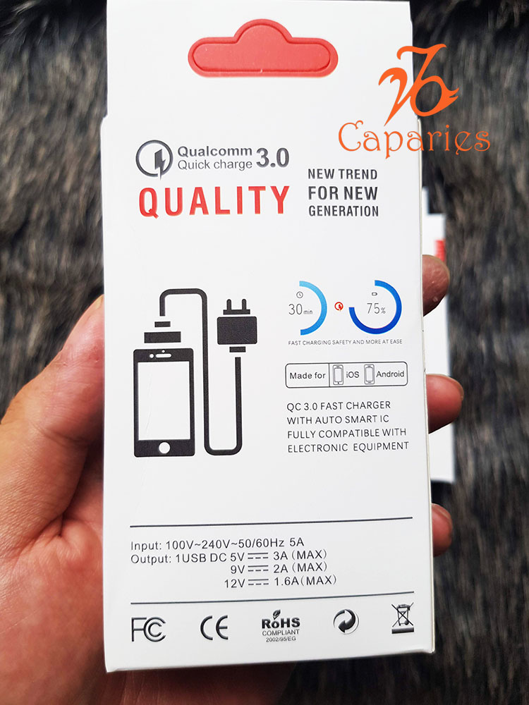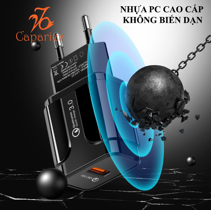 Bộ sản phẩm Củ Sạc Nhanh Quick Charge 3.0 Siêu Bền, 1 cổng USB , Chống Nóng, Sạc Nhanh 3.0 – Chính Hãng CAPARIES VIỆT NAM Thương hiệu: CAPARIES.
