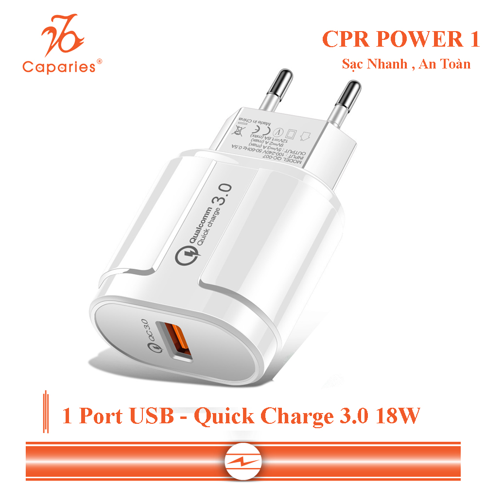 Bộ sản phẩm Củ Sạc Nhanh Quick Charge 3.0 Siêu Bền, 1 cổng USB , Chống Nóng, Sạc Nhanh 3.0 – Chính Hãng CAPARIES VIỆT NAM, Thương hiệu CAPARIES Model CUSAC_01USB SKU 8317630315001.