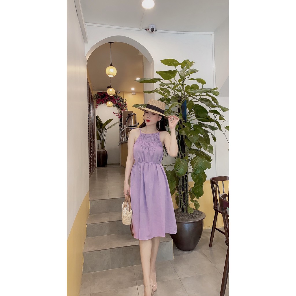 Bộ sản phẩm: Đầm 2 dây nhúm ngực 3 vòng thắt nơ chất đũi tiểu thư.
