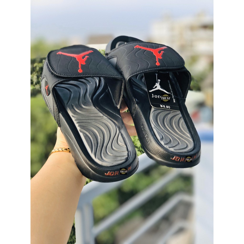 Bộ sản phẩm: DÉP jordan hydro QUAI NGANG JD NHUNG ĐEN XÁM LOGO ĐỎ.