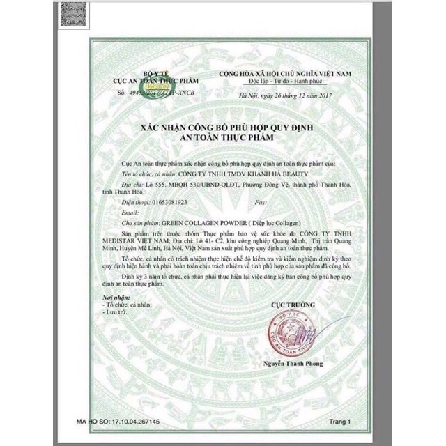 quy cách:1 hộp 30 gói HSD: 3 năm kể từ ngày sản xuất Cách sử dụng: Pha 1 gói vào 200ml nước ấm và uống và buổi sáng, sau mỗi bữa ăn tuỳ sở thích của mọi người. 1 ngày có thể pha uống 1-2 gói đều được. Sản phẩm được sản xuất bởi CTY TNHH DƯỢC PHẨM KHÁNH HÀ BEAUTY KCN MÊ LINH THỊ TRẤN MÊ LINH HÀ NỘI diệp lục collagen, một sản phẩm của công ty có tác dụng hỗ trợ làm chậm quá trình oxy hóa, giảm nguy cơ lão hóa da, nhăn da, làm da sáng hơn, mặt khác còn làm tăng tính đàn hồi của da, làm mờ các vết thâm nám, tàn nhang, tốt cho tóc, móng và hỗ trợ tăng cường sức khỏe và sinh lý nữ. ☀ Dùng cho phụ nữ da bị nhăn, nám da, da mất tính đàn hồi, sạm và khô da. ☀ Người thường xuyên phải làm việc ngoài trời và hay tiếp xúc với các tác nhân gây hại cho da. ☀ Phụ nữ tiền mãn kinh xuất hiện các triệu chứng như bốc hỏa, kém tươi sắc, tóc khô xơ, rụng nhiều. ☀ Các bạn trẻ đã có làn da đẹp hoặc muốn bổ sung collagen cho da cũng có thể tảo diệp lục collagen hàng ngày, giữ da sáng và ngày càng đẹp hơn. Sản phẩm không phải là thuốc,không có tác dụng thay thế thuốc chữa bệnh