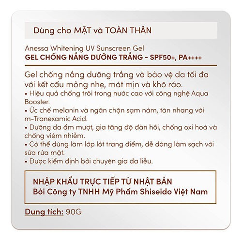 Trên đây là toàn bộ thông tin về sản phẩm Gel chống nắng dưỡng trắng Anessa Whitening UV Sunscreen Gel 90g_14719 mà shop giới thiệu, hy vọng sẽ làm quý khách hài lòng.