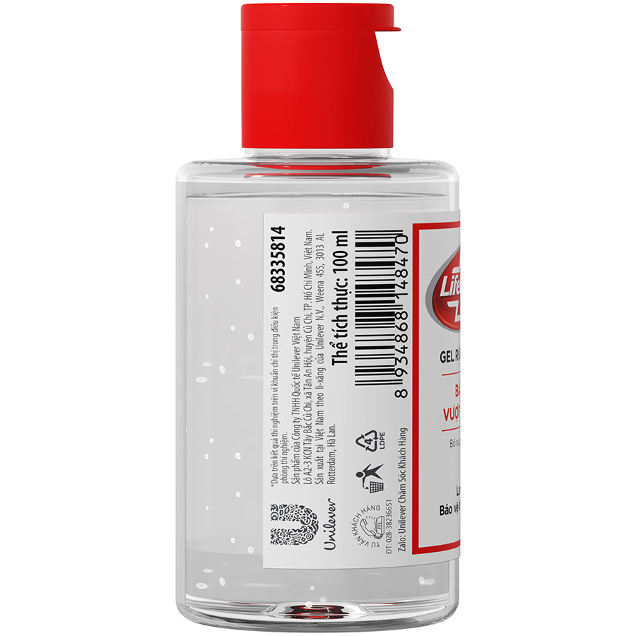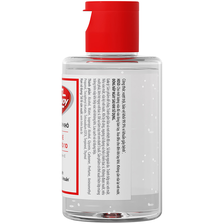 Với công thức vượt trôi, bảo vệ khỏi 99.9% vi khuẩn gây bệnh Thích hợp sử dụng trong các trường hợp không có xà phòng hoặc nước Bổ sung Vitamin E cùng các chất dưỡng ẩm tự nhiên Giữ cho bàn tay luôn mềm mịn, không gây khô da Gel Rửa Tay Khô Sạch Siêu Nhanh Lifebuoy Bảo Vệ Vượt Trội 10 (Chai Nắp 100ml) với công thức vượt trôi, bảo vệ khỏi 99.9% vi khuẩn gây bệnh, thích hợp sử dụng trong các trường hợp không có xà phòng hoặc nước. Đồng thời, bổ sung Vitamin E cùng các chất dưỡng ẩm tự nhiên, giữ cho bàn tay luôn mềm mịn, không gây khô da. Kiểu dáng nhỏ gọn, phù hợp sử dụng khi không có điều kiện sử dụng xà phòng & nước (khi đi du lịch, khi đi học, đi làm, sau khi đếm tiền,). Chỉ cần cho một lượng vừa đủ vào lòng bàn tay. Xoa đều cho đến khi tay khô, không cần rửa lại với nước. Theo khuyến cáo của Tổ chức Y tế Thế giới WHO – Vẫn cần ưu tiên sử dùng xà phòng/NRT & nước sạch khi có thể.