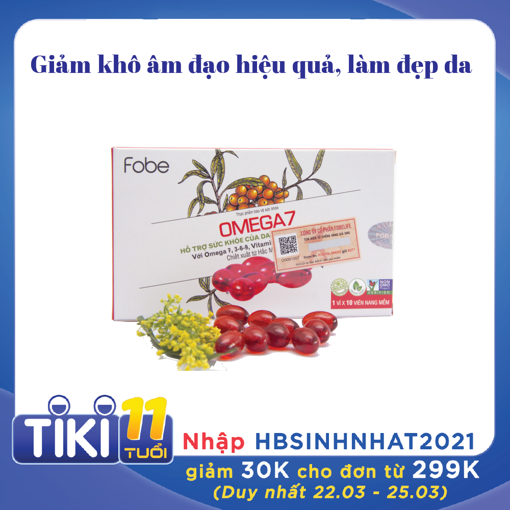 FoBeOmega7 với chiết xuất từ Hắc Mai Biển được nhập khẩu từ Tây Tạng có chứa Omega 7, Omega 3-6-9, Betacaroten, Vitamin E giúp cải thiện và hỗ trợ sức khỏe của làn da hiệu quả. Đặc biệt : Giúp giảm KHÔ ÂM ĐẠO HIỆU QUẢ. Sử dụng được cho người bị u xơ, u nang mà không làm tăng kích thước khối u. Thành phần Trong một viên nang mềm có chứa 500mg dầu Hắc Mai Biển, trong đó: Omega 7……… Omega 9…………90mg Omega 3…………65mg Omega 6…………50mg Vitamin E…………4,5mg Beta caroten…….1mg Gelatin, chất làm dày: glycerol, nước tinh khiết vừa đủ 1 viên nang mềm Công dụng Giúp giảm khô âm đạo hiệu quả. Hỗ trợ tăng cường sức khỏe của da, giúp giảm khô da, giảm nhắn da, tăng cường độ ẩm cho da Hỗ trợ cải thiện thị lực, giúp giảm mỏi mắt, giảm khô mắt Đối tượng sử dụng Người bị da khô, da nhăn nheo Người bị suy giảm thị lực, khô mắt, ngứa mắt, mỏi mắt. Sử dụng được cho người bị u xơ, u nang mà không làm tăng kích thước khối u. Liều dùng Uống tốt nhất cùng với bữa ăn Trẻ em từ 6-15 tuổi: Dùng 1 viên/ ngày Trẻ em trên 16 tuổi và người lớn: Dùng 1-2 viên mỗi ngày Trường hợp cần có thể dử dụng 4 viên/ ngày Liều duy trì : 1 viên/ ngày Bảo quản Nơi khô ráo, thoáng mát, tránh ánh nắng mặt trời trực tiếp Lưu ý Thực phẩm này không phải là thuốc và không có tác dụng thay thế thuốc chữa bệnh Không dùng cho người mẫn cảm với bất kì thành phần nào của sản phẩm Dùng được cho người ăn chay Thông tin thêm Quy cách đóng gói: Hộp 10 viên nang mềm