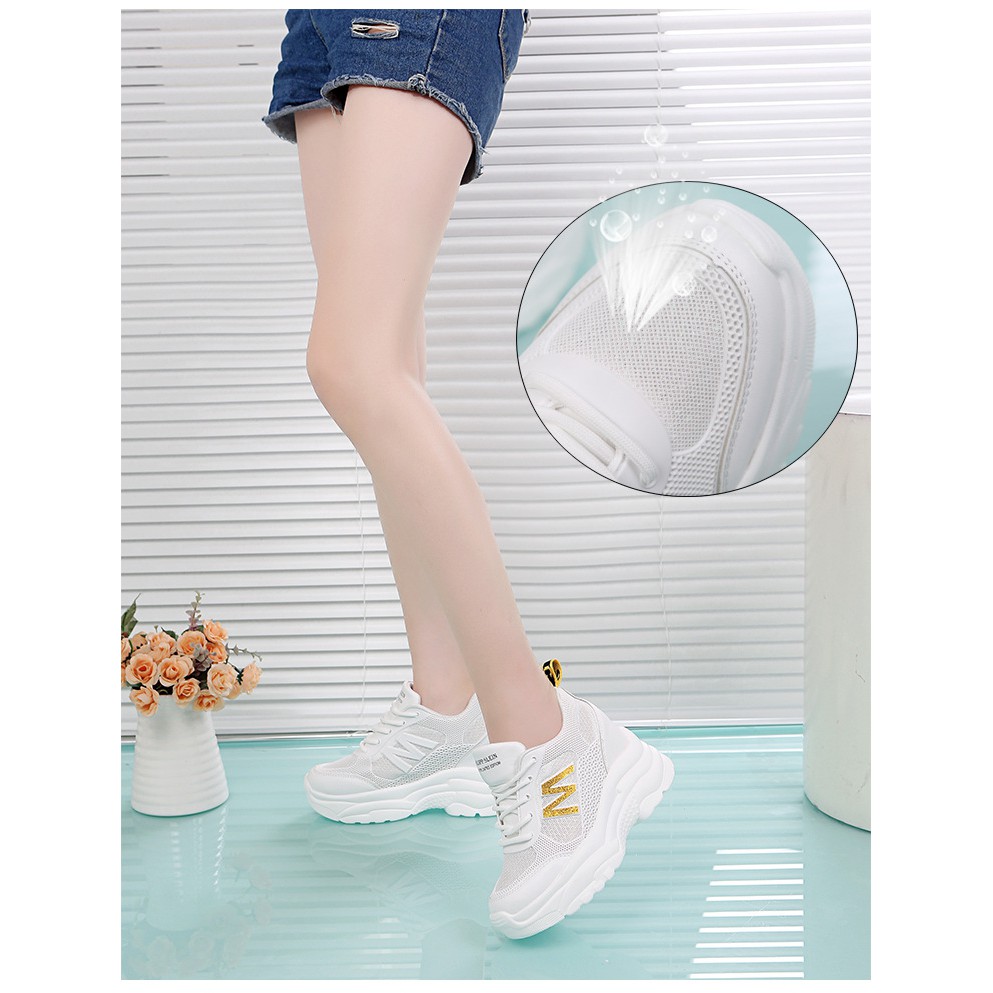 Giày thể thao nữ độn đế chữ M màu trắng phong cách thời trang Hàn Quốc Với thiết kế năng động trẻ trung thì siêu phẩm này rất dễ phối đồ với các kiểu phong cách thời trang – Bề mặt phần mu giày là sự kết hợp của da tổng hợp bền bỉ mà rất mềm đan xen với cao su non đúc liền tạo sự đồng nhất với lớp vải canvas chuyên dụng cho dòng giày thể thao. – Điểm nhấn của siêu phẩm này chính là chữ M cách điệu tạo nên sự khỏe khoắn với màu nhũ trắng hoặc vàng – Đế đúc liền khối bằng cao su non liền khối đảm bảo sự bền bỉ với khả năng bám đường tốt giúp bạn có nhưng bước đi chắc chắn, tự tin – Một chi tiết không thể không nhắc tới trên siêu phẩm này là lớp lót đế. Lớp lót được thiết kế giúp cho chị em tôn chân lên 5cm cộng với phần đế giày thì chân của chị em cứ phải nói là miên man