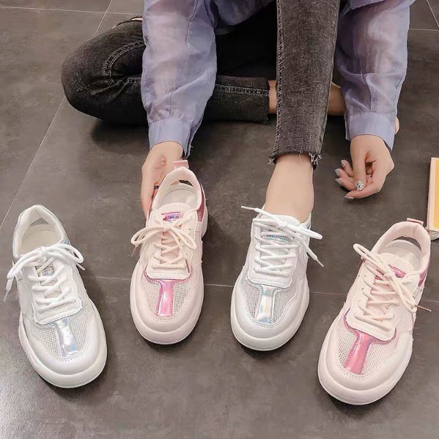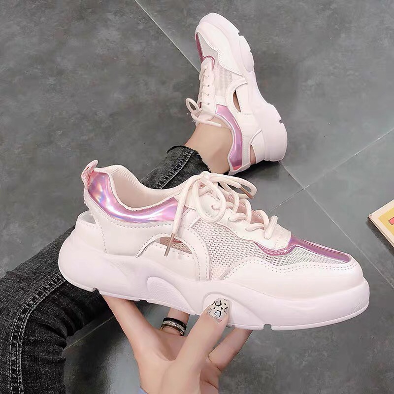 Bộ sản phẩm: Giày thể thao nữ, giày sneaker nữ phối lưới thoáng khí mũi giày tráng gương.