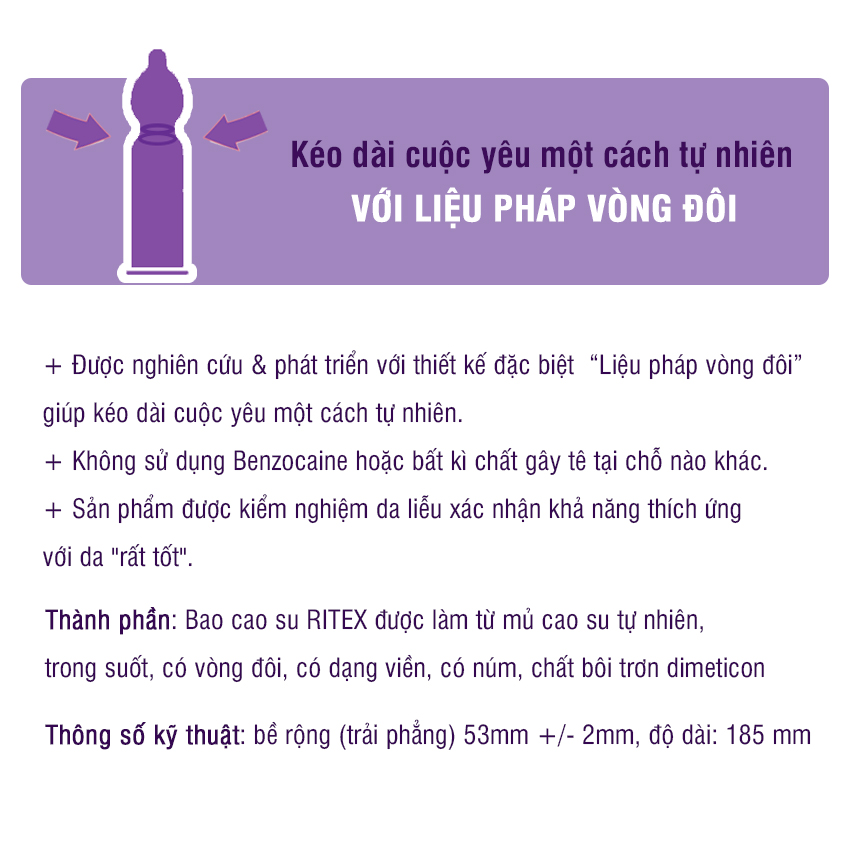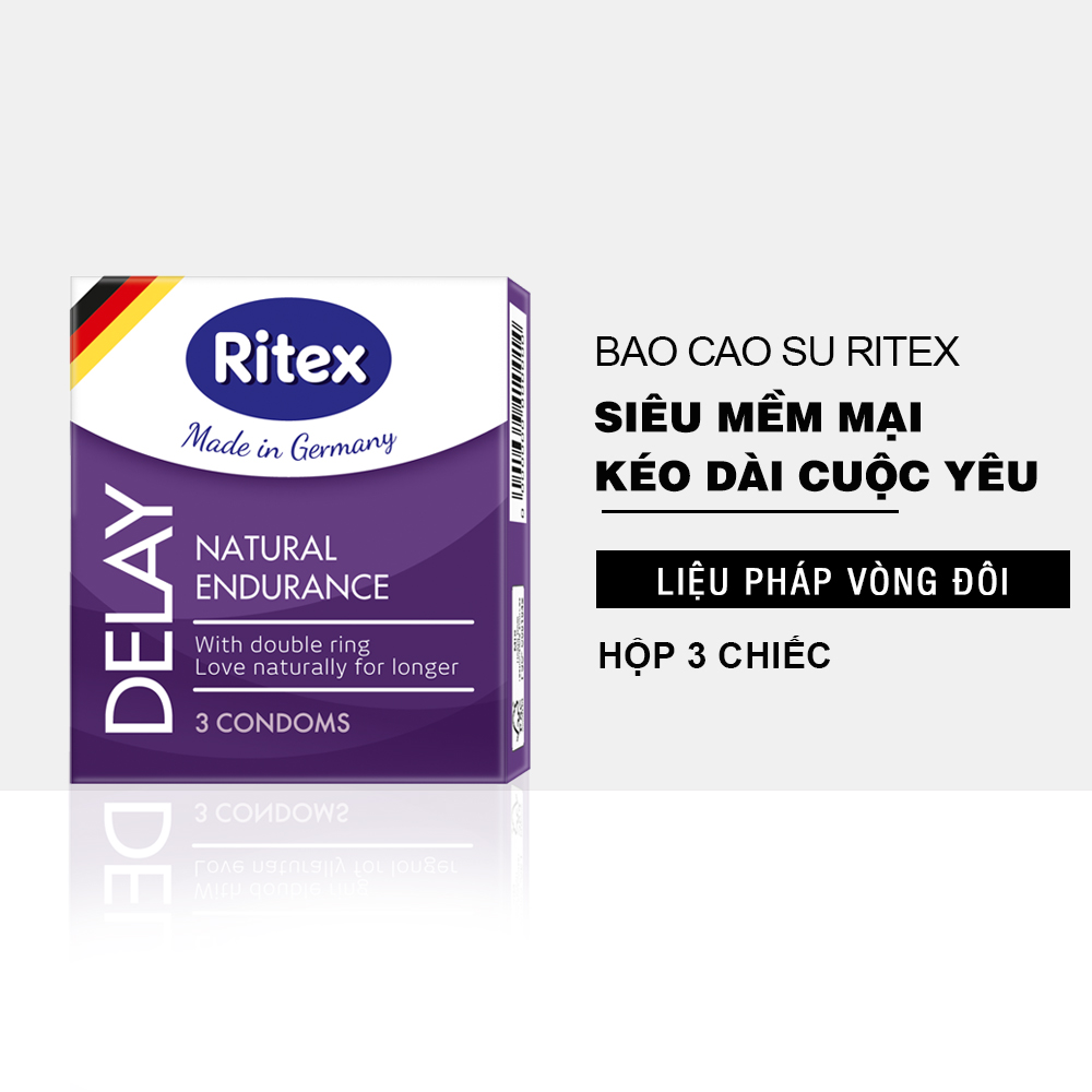 BAO CAO SU RITEX DELAY – KÉO DÀI THỜI GIAN Nguyên liệu sản xuất tốt nhất: Ritex được sản xuất bởi nguyên liệu cao su thiên nhiên chất lượng cao nhất, cam kết xử lý theo tiêu chuẩn Quy trình sản xuất: Ritex sử dụng công nghệ tiên tiến, trên nhà máy hiện đại. Hệ thống dây truyền tự động và kiểm tra từng bao cao su duy nhất để đảm bảo chắc chắn cho mỗi sản phẩm. Kiểm soát chất lượng: Tất cả các khâu sản xuất từ nguyên liệu đến thành phẩm được kiểm soát chặt chẽ. Được kiểm tra tại phòng thí nghiệm với các tiêu chuẩn như độ bền, độ dai … Tiêu chuẩn AN TOÀN sản phẩm: Sản phẩm Ritex được chứng nhận chất lượng bởi các tiêu chuẩn cao của liên minh Châu Âu TOP 4 được tin dùng tại Đức