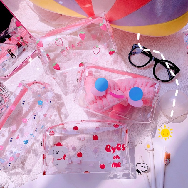 Bộ sản phẩm: Hộp bút túi đựng mỹ phẩm trong suốt dâu tây Tom House khổ size to.
