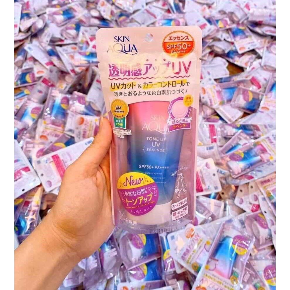 KEM CHỐNG NẮNG SKIN AQUA Tone Up UV Essence SPF50+ PA++++ Phân Loại * Made in Japan (Sản xuất tại Nhật Bản) – Essence Hồng 80gr – Essence Xanh 80gr – Milk 40ml Hồng * Made in Việt Nam (Sản Xuất tại Việt Nam) – Essence Hồng 50gr – Essence Xanh 50gr – Milk Hồng 50gr – Milk Xanh 50gr ——————————————————————- Dòng sản phẩm mới nhất của Rohto Japan, vừa được ra mắt vào tháng 2/2018 -là kem chống nắng mới nhất của Skin Aqua đặc biệt có khả năng làm nâng tone da với những “hạt tím” li ti bắt sáng sau khi sử dụng.Giúp làn da xạm màu, xanh xao thiếu sức sống sáng bừng & hồng hào lên trông thấy. Chỉ số chống nắng SPF50+ PA++++ cao nhất dành cho da mặt giúp bảo vệ tuyệt đối khỏi tia UV có hại, ngăn ngừa thâm nám, tàn nhang. – Chiết xuất từ: -Vitamin C, Chanh Dây, Mận đã được thuỷ phân : làm sáng da & chống oxy hoá dưới tác động của tia UVA & UVB. – cân bằng pH, dưỡng mềm & bảo vệ da, làm sáng da. Đặc biệt còn làm dịu, tái tạo da khi bị cháy nắng. – Đóng vai trò như kem lót trang điểm (makeup base). Cực phù hợp với xu hướng makeup “trong veo” nhẹ nhàng đi học, đi làm. Chống nước & mồ hôi. Phù hợp MỌI LOẠI DA. – Dưỡng ẩm da với thành phần chiết xuất sữa ong chúa và Hyaluronic Acid, thích hợp với mọi loại da, dịu nhẹ không kích ứng. -Ngay khi thoa lên, Essence nhanh chóng chuyển thành dạng lỏng như nước, thẩm thấu tuyệt đối vào da, để lại cảm giác tươi mát, khô thoáng. Khả năng thẩm thấu cực nhanh, không dính rít, không bóng nhờn, có thể sử dụng như lớp lót trước khi trang điểm. – Hương thơm lavender dễ chịu và tươi mát. #biore #sunscreen #hangnhatxachtay #duongnhanchongnang
