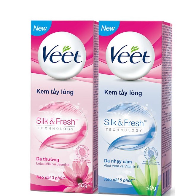 “Kem tẩy lông Veet Silk & Fresh – Lotus Milk & Jasmine có tác dụng tẩy lông, dưỡng ẩm da. Công nghệ hương thơm mới, đảm bảo không để lại mùi khó chịu. Kem tẩy lông có mùi thơm của sữa sen và hoa nhài. Sản phẩm sử dụng cho da thường. Hướng dẫn sử dụng: – Bước 1: Dùng phần cong của thìa để trải kem phủ đều trên lông. – Bước 2: Để kem trên da khoảng 3 phút, sau đó kiểm tra bằng cách dùng thìa lấy 1 phần kem nhỏ trên da. Nếu lông tách ra dễ dàng, dùng đầu thìa loại bỏ kem trên bề mặt da. Nếu kem vẫn còn chắc, có thể để kem trên da tổng cộng 6 phút (không được để lâu hơn). – Bước 3: Rửa cho da thật sạch dưới nước để loại bỏ kem. LƯU Ý KHI SỬ DỤNG – Không để trên da quá 10 phút và phải rửa lại với nước. – Không trải kem trên phần da bị tổn thương, bị kích ứng. Và những vùng da không phù hợp (Hướng dẫn trên bao bì) – Trẻ em dưới 16 tuổi phải có giám sát của người lớn khi sử dụng. – Mỗi lần sử dụng sản phẩm nên cách nhau 24 tiếng.