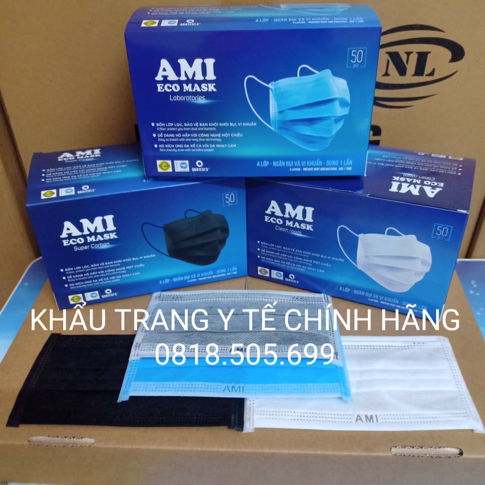 KHẨU TRANG Y TẾ 4 LỚP AMI HÀNG CHUẨN CÔNG TY (HỘP 50 CÁI) – CAM KẾT HÀNG CHÍNH HÃNG, GIÁ RẺ NHẤT THỊ TRƯỜNG! – Khẩu trang y tế 4 lớp kháng khuẩn hiệu AMI, giấy tờ kiểm nghiệm chất lượng đầy đủ, hàng chuẩn công ty có tên hiệu in dập nổi trên khẩu trang. Bà con cô bác yên tâm tuyệt đối về chất lượng ạ. – Khẩu trang AMI có tác dụng kháng khuẩn, kháng nước, ngăn giọt bắn đường hô hấp hiệu quả. Dây thun đeo tai co giãn dễ chịu. – Quy cách đóng gói: 1 hộp 50 cái. Bà con cô bác hãy sáng suốt lựa chọn khẩu trang đảm bảo chất lượng để bảo vệ sức khỏe cho bản thân và cộng đồng! Tư vấn mua hàng: 0818.505.699 Khách mua sỉ vui lòng inbox để có giá tốt nhất!