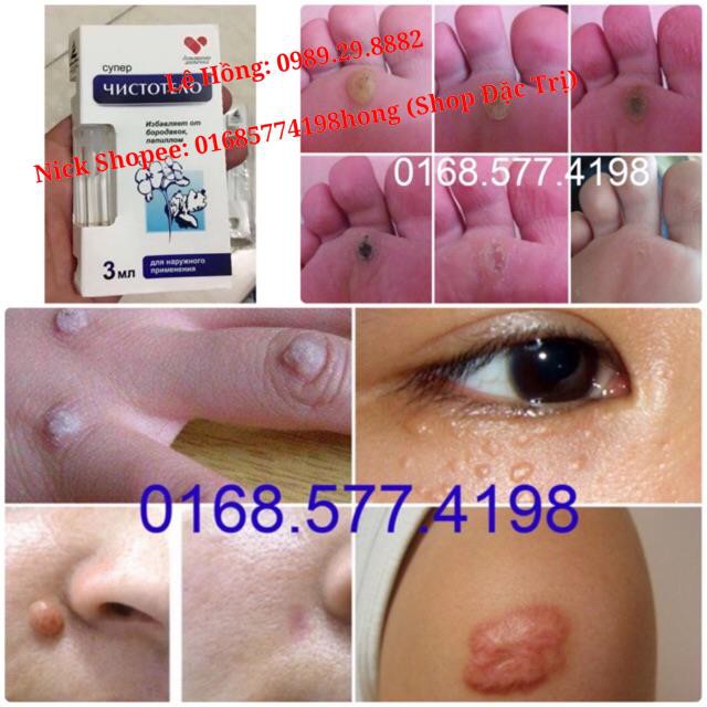 0989.29.8882 Shop Đặc Trị > 100% CHỈ BÁN HÀNG CHUẨN & CHÍNH HÃNG GEL Dvelinil TẨY NỐT RUỒI, MỤN CƠM, MỤN CÓC, SẸO LỒI, THỊT THỪA Là một loại gel lỏng có kiềm tính cao. Chuyên tẩy các nốt ruồi, mụn cóc, mụn cơm, sẹo lồi, thịt thừa không mong muốn trên làn da… Hãng sản xuất: Dvelinil nhập khẩu Nga – CAM KẾT HÀNG CHUẨN Thành phần: Nước cất, Natri Hydroxit or kali hydroxit ✔ Gel đảm bảo hiệu quả tẩy rất tốt, tẩy sạch khi các b dùng chuẩn cách nhé 😉 HƯỚNG DẪN SỬ DỤNG: ➦ Đối với nốt ruồi và tàn nhang: chấm một lần duy nhất vào nốt tàn nhang hay nốt ruồi không dư ra ngoài. sau 30p – 60p thấm khô lau đi. sau 5-7 ngày để tự tróc sạch, k đc bóc gở. Nốt nào chưa tróc thì chấm thêm 1 lần nữa . ➦ Đối với MỤN CÓC, SẸO LỒI: chấm 3 ngày liên tục vào mỗi buổi tối để qua đêm (chỉ chấm 1 lần trong ngày) ➦ Đối với MẮT CÁ (KÉ) trước khi chấm thuốc cần cắt hoặc vít tróc da giữa mục rồi chấm thuốc, sau khi chấm thuốc dùng băng keo băng lại, mỗi tối chấm 1 lần, liên tục trong 5 ngày. ➦ Đối với MỤN CƠM (GẠO) VÀ THỊT CON: chấm 2 ngày liên tục vào mỗi buổi tối để qua đêm ✌ Nếu là da sừng, chưa tróc hết, cần tẩy thêm 1 lần nữa nhưng không sớm hơn 3 ngày sau lần sử dụng đầu tiên ✌ Để da không có vết sẹo và thâm sau khi tẩy sạch xong và da đã lành chúng ta nên bôi Kem trị sẹo, chống thâm… ❌ CHÚ Ý: ➦ 3 ngày đầu hạn chế ko để nước vào vết tẩy ➦ Chấm bôi 1 lượng gel vừa đủ lên vùng cần cần tẩy…Chỉ chấm vừa đủ trong mục ko dư ra ngoài (ví dụ mục tròn 3mm lấy tăm nhọn chấm nhỏ hơn khoảng 2mm). Với nốt nhỏ, NHỚ SỬ DỤNG ĐẦU TĂM CHẤM GỌN TRONG MỤC ➦ Không nên sử dụng cho những nốt quá sát môi và mắt. ➦ Kiêng ăn trứng, rau muống trong thời gian sử dụng. Sỉ zalo > 0989.29.8882 Lê Hồng
