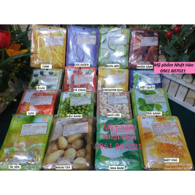 MẶT NẠ 3D HÀN QUỐC FOODAHOLIC 16 loại **************** Mặt nạ 3D Foodaholic cung cấp cho da dưỡng chất chống lại ô nhiễm môi trường bên ngoài, xóa bỏ các nếp nhăn và phục hồi khả năng đàn hồi tự nhiên của da. Mặt nạ chiết xuất hoàn toàn từ thiên nhiên, không gây kích ứng cho da kể kả là da nhạy cảm, dạng giấy, tiện lợi, tiết kiệm thời gian và công sức. *Lưu ý: Trước khi đắp rửa sạch mặt, dùng 3 – 4 lần một tuần để có được làn da viên mãn. Không sử dụng lại mặt nạ đã sử dụng. Có 16 loại cho bạn thoải sức lựa chọn và trải nghiệm: Sâm,Lựu, collagen,Khoai tây, Nha đam,Trà xanh, Đậu xanh, Việt quất, Dưa leo, Cà chua, Dầu olive, Ốc sên, Sáp ong, Cam, Lúa mạch, Coenzym Q10 1.Dưa leo (Cucumber): Cung cấp độ ẩm và dinh dưỡng cho da. Giúp se khít lỗ chân lông, ngăn ngừa mụn, làm mềm mịn và chống khô da. 2.Nha đam (Aloe vera): Giúp làm mát da, tính sát khuẩn cao, giúp se khít lỗ chân lông, dưỡng trắng da và làm da thêm bóng mượt. 3.Trà xanh (Green tea): Phục hồi làn da dưới tác hại của ánh nắng mặt trời, lọc bỏ độc tố trên da, ngăn chăn lão hóa sớm, làm da căng mịn và tăng độ sáng của da, thúc đẩy quá trình thay đổi tế bào mới. 4.Nhân sâm (Ginseng): Cung cấp dinh dưỡng cho da trắng sáng. Làm da sáng mịn màng, săn chắc, phục hồi làn da thiếu sức sống, nuôi dưỡng da khỏe mạnh, giảm vết thâm nám. 5.Lựu (Pomegranate): Bảo vệ và làm trắng vùng da bị tổn thương do ánh nắng mặt trời, nhẹ nhàng làm sạch bụi bẩn trên da, tăng tính đàn hồi, phục hồi làn da trắng hồng khỏe mạnh. 6.Cà chua Tomato – Chiết xuất từ trái cà chua, giàu vitamin và khoáng chất, cung cấp độ ẩm cho da khô, giúp làn da sáng rực rỡ. 7.Ốc sên Snail: phục hồi da, chống lão hoá, không chỉ chăm sóc da trên gương mặt mà còn chăm sóc da toàn thân. Chất Allantion được chiết suất từ chất nhầy của Ốc Sên rất giàu Protein, Vitamin và Canxi, có tác dụng tái tạo da, làm trắng da, nhẵn mịn và căng da. Hiệu quả tuyệt vời cho các vết tàn nhang, vết nám, vết nhăn trên gương mặt. 8.Collagen: Collegen là một loại protein có tác dụng làm trẻ hóa làn da. Hàm lượng tinh chất collagen trong mặt nạ 3D FoodaHolic cung cấp cho da dưỡng chất chống lại ô nhiễm môi trường bên ngoài, xóa bỏ các nếp nhăn và phục hồi khả năng đàn hồi tự nhiên của da. 9.Đậu xanh: Thải độc, kiểm soát độ dầu của da, ngăn ngừa mụn trứng cá phát triển, làm cho làn da trở nên mịn màng, thu nhỏ lỗ chân lông. Chiết xuất 100% từ hạt đậu xanh tươi. 10.Ô-liu tươi: giàu polyphenol, một chất cung cấp từ thiên nhiên, để dưỡng ẩm và làm mềm làn da khô và thô ráp. 11.Cam Orange: Lấy đi tế bào chết trên da, nuôi dưỡng làm trắng da. 12.Sáp ong thiên nhiên: nuôi dưỡng và giúp da mịn màng, căng mọng. 13.Việt quất: giàu vitamin và khoáng chất, giúp làn da sáng rực rỡ. 14.Ngũ cốc: giàu khoáng chất, giúp làn dưỡng da hiệu quả 15.Ngải cứu: mát da, dưỡng ẩm, kháng khuẩn 16.Coenzym Q10: Thành phần giàu các chất dưỡng ẩm từ thiên nhiên giúp da chống lại tia cực tím, giảm nếp nhăn, trắng mịn, mềm mượt, đàn hồi và khỏe mạnh. #mặtnạdưỡngda #mặtnạ3d #mặtnạ3dfoodaholic