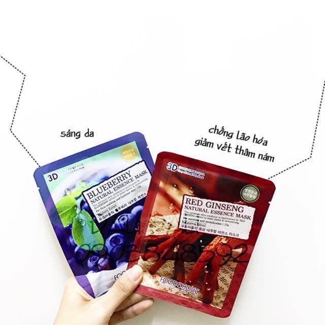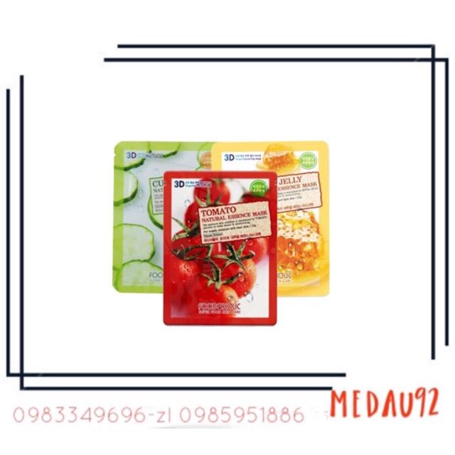 Đắp mặt nạ tại nhà là một trong những phương pháp tiết kiệm và hiệu quả để bổ sung thêm dinh dưỡng nuôi dưỡng da, mang lại cho bạn 1 làn da trắng sáng, mịn màng. Mặt Nạ Dưỡng Da 3D Foodaholic: – Giá: 8k/miếng – Chiết xuất 100% từ các thành phần tự nhiên. – Thích hợp với mọi loại da, kể cả da nhạy cảm. 1. Mặt nạ dưỡng da tinh chất dưa leo (Cucumber): Cung câp độ ẩm và dinh dưỡng cho da. Giúp se khít lỗ chân lông, ngăn ngừa mụn, làm mềm mịn và chống khô da. 2. Mặt nạ dưỡng da tinh chất lô hội (Aloe vera): Giúp làm mát da, tính sát khuẩn cao, giúp se khít lỗ chân lông, dưỡng trắng da và làm da thêm bóng mượt. 3. Mặt nạ dưỡng da tinh chất trà xanh (Green tea): Phục hồi làn da dưới tác hại của ánh nắng mặt trời, lọc bỏ độc tố trên da, ngăn chăn lão hóa sớm, làm da căn mịn và tăng độ sáng của da, thúc đẩy quá trình thay đổi tế baò mới. 4. Mặt nạ dưỡng da tinh chất nhân sâm (Ginseng): Cung cấp dinh dưỡng cho da trắng sáng. Làm da sáng mịn màng, săn chắc, phục hồi làn da thiếu sức sống, nuôi dưỡng da khỏe mạnh, gỉam vết thâm nám. 5. Mặt nạ dưỡng da tinh chất quả lựu (Pomegranate): Bảo vệ và làm trắng vùng da bị tổn thương do ánh nắng mặt trời, nhẹ nhàng làm sạch bụi bẩn trên da, tăng tính đàn hồi, phục hồi làn da trắng hồng khỏe mạnh. 6. Mặt nạ cà chua 3D Foodaholic – Chiết xuất từ trái cà chua, giàu vitamin và khoáng chất, cung cấp độ ẩm cho da khô, giúp làn da sáng rực rỡ. 7. Mặt nạ Ốc sên: Mặt nạ ốc sên 3D Foodaholic phục hồi chống lão hoá, không chỉ chăm sóc da trên gương mặt mà còn chăm sóc da toàn thân. Chất Allantion được chiết suất từ chất nhầy của Ốc Sên rất giàu Protein, Vitamin và Canxi, có tác dụng tái tạo da, làm trắng da, nhẵn mịn và căng da. Hiệu quả tuyệt vời cho các vết tàn nhang, vết nám, vết nhăn trên gương mặt. 8. Mặt nạ Collagen: Collegen là một loại protein có tác dụng làm trẻ hóa làn da. Hàm lượng tinh chất collagen trong mặt nạ 3D FoodaHolic cung cấp cho da dưỡng chất chống lại ô nhiễm môi trường bên ngoài, xóa bỏ các nếp nhăn và phục hồi khả năng đàn hồi tự nhiên của da. 9. Mặt nạ đậu xanh: Thải độc, kiểm soát độ dầu của da, ngăn ngừa mụn trứng cá phát triển, làm cho làn da trở nên mịn màng, thu nhỏ lỗ chân lông. Chiết xuất 100% từ hạt đậu xanh tươi. 10. Mặt nạ được chiết xuất từ ô liu tươi, giàu polyphenol, một chất cung cấp từ thiên nhiên, để dưỡng ẩm và làm mềm làn da khô và thô ráp. 11. Mặt nạ cam: Lấy đi tế bào chết trên da, nuôi dưỡng làm trắng da. 12. Mặt nạ chiết xuất mật ong thiên nhiên với tinh chất mật ong nuôi dưỡng và giúp da mịn màng, căng mọng. 13. Mặt nạ việt quất 3D Foodaholic – Chiết xuất từ trái việt quất, giàu vitamin và khoáng chất, giúp làn da sáng rực rỡ.