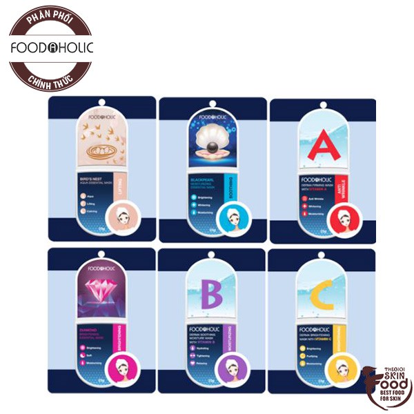 Mặt Nạ Giấy Chăm Sóc Da Toàn Diện Foodaholic Essential Mask 23g – Xuất xứ: Hàn Quốc – Thương hiệu: Foodaholic – Khối lượng: 23g THÔNG TIN CHI TIẾT: – Foodaholic Essential Mask giàu dưỡng chất và thành phần chính đa dạng để bổ sung phần khiếm khuyết cho da. – Có các chiết xuất khác nhau cho bạn tha hồ lựa chọn: + Blackpearl Moisturizing: Dưỡng trắng da + Diamond Brightening: Dưỡng sáng da + Birds Nest Aqua: Làm dịu, sane chắc da + Collagen Anti Anging: Săn chắc da + Vitamin K: Thu nhỏ lỗ chân lông, làm dịu da + Vitamin B: Dưỡng ẩm , thu nhỏ lỗ chân lông + Vitamin C: Dưỡng trắng da + Vitamin D: Phục hồi, tái tạo da + Vitamin E: Dưỡng ẩm, cấp nước + Vitamin A: Chống lão hóa, dưỡng trắng HƯỚNG DẪN SỬ DỤNG: – Lấy mặt nạ ra khỏi bao bì, đắp lên mặt tránh vùng mắt môi – Thư giãn 15-20 phút, sau đó gỡ mặt nạ ra. Dùng tay vỗ nhẹ cho dưỡng chất thẩm thấu sâu và da