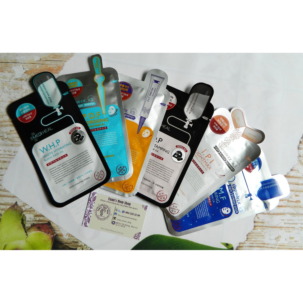*I.P.I #Lightmax Ampoule Mask (27ml) Giúp làm sáng da bằng cách phá hủy melanin trên bề mặt da va cung cấp độ ẩm cho da mềm mại. Không gây kích ứng, không chứa chất hóa học độc tính dùng được cho làn da nhạy cảm. Giúp cho làn da của bạn sáng hơn vượt trội, cung cấp dưỡng chất và dưỡng ẩm cho da, giúp cải thiện làn da xỉn màu rõ rệt. * N.M.F #Aquaring Ampoule Mask (25ml) chứa thành phần N.M.F là ampoule masks (mặt nạ tinh chất), tập trung đặc trị cao cấp hơn cả serum. Ngoài ra, Hyaluronic Acid, Ceramide, Adenosine và các thành phần dưỡng ẩm cung cấp độ ẩm cần thiết cho làn da trong nhiều giờ. Với công thức dưỡng ẩm tối ưu, mặt nạ giúp bạn loại bỏ các vùng khô, kiềm dầu và giảm sự có mặt của lỗ chân lông. * H.D.P #PoreStamping Charcoal-Mineral Mask (27ml) có thành phần than hoạt tính hay còn gọi là than vàng chỉ được sản xuất bởi cây dẻ gai ở vùng Kyushu – Nhật Bản. Than hoạt tính cung cấp khoáng chất cho da, điều chỉnh việc bài tiết dầu và kiểm soát mụn trên da đồng thời có tác dụng se khít lỗ chân lông. *W.H.P #WhiteHydrating Black Mask Ex (25ml) Thanh tẩy rất tốt mà lại lành tính, lấy đi bụi bẩn, độc tố sâu dưới lỗ chân lông da, mang lại cho làn da sự tươi mới, sạch sẽ, thoáng mát đến ngạc nhiên. Chứa dưỡng chất cấp ẩm tối ưu cho da, cấp nước cho da duy trì độ ẩm sâu, nuôi dưỡng làn da căng mượt, mịn màng tràn đầy sức sống. * P.D.F AC-#DRESSING AMPOULE MASK (25ml) Nhẹ nhàng làm sạch lỗ chân lông, cung cấp độ ẩm cho làn da mịn hơn và phục hồi độ đàn hồi của da từ sâu bên trong, lớp biểu bì dưới da thực sự khỏe mạnh. Làm dịu mát và thư giãn các tế bào, giúp làm mịn làn da hiệu quả. * Mặt Nạ Mediheal E.G.T #Timetox ampoule mask là mặt nạ dưỡng trắng chứa các chiết xuất từ thiên nhiên, thúc đẩy sự tăng trưởng của tế bào biểu bì giúp cải thiện trắng sáng hơn.