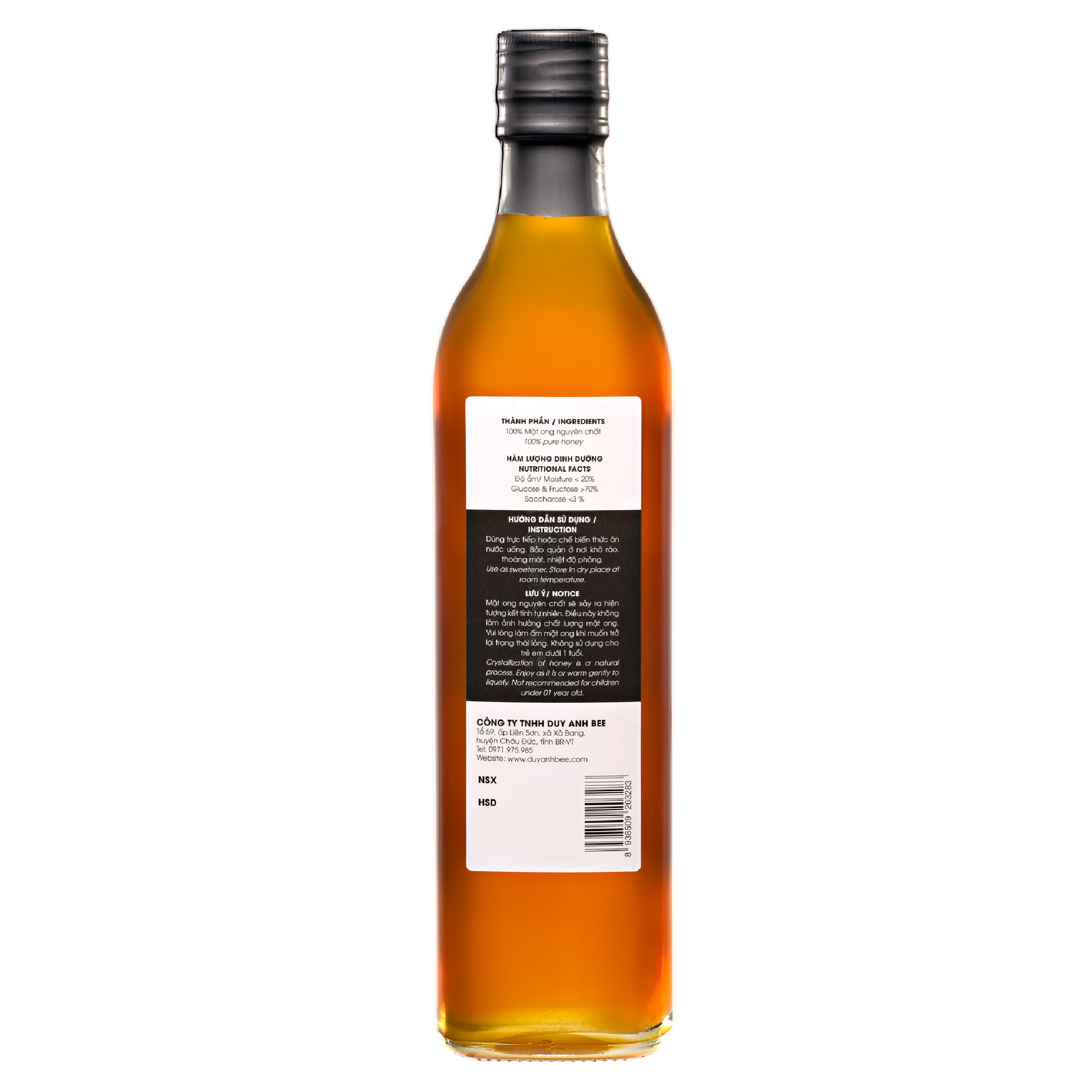 Mật ong nguyên chất đa hoa hương vị thơm ngon, dễ sử dụng Mật ong không qua xử lý công nghiệp và pha trộn, đảm bảo vẹn nguyên các vytamins, dưỡng chất trong mật ong. Đã qua kiểm nghiệm và đảm bảo các chỉ tiêu chất lượng cao nhất. Không đường mía, không kháng sinh và thuốc trừ sâu, không carbendazim. Đậm đặc với thuỷ phần tự nhiên 20%. Dùng mật ong hàng ngày giúp tăng cường sức đề kháng, cung cấp năng lượng, phòng chống bệnh tật. Hơn 30 năm kinh nghiệm với nghề nuôi ong, Duy Anh Bee đã đem đến những sản phẩm mật ong nguyên chất, mộc mạc và thuần khiết, trân trọng giá trị mà thiên nhiên ban tặng. Duy Anh Bee hạn chế tối đa sự can thiệp, không trộn lẫn, tinh lọc, gia nhiệt nhằm bảo toàn các enzyme, vitamin, dưỡng chất và hương vị đặc trưng của từng loại mật ong. Mật ong nguyên chất 700g Duy Anh Bee với hương vị ngọt thanh, hương thơm dễ chịu, thích hợp cho các khách hàng, đối tác chế biến thức ăn, nước uống. Toàn bộ mẫu mật ong ở Duy Anh Bee đều được kiểm nghiệm chỉ tiêu chất lượng, không thuốc kháng sinh, hóa chất và theo sát chuẩn vệ sinh an toàn thực phẩm. Nên việc sử dụng mật ong Duy Anh Bee để làm tăng thêm hương vị trong quá trình chế biến thức uống, hoặc món ăn là sự lựa chọn hoàn hảo.