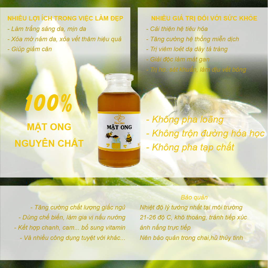 Sản phẩm mật ong Beemo 35g này là quà tặng khi mua bất kì sản phẩm nào của shop Beemo Những thùng ong của Beemo được đặt tại trang trại cà phê, nên đảm bảo mật ong nguyên chất 100% Mật ong nguyên chất thơm mùi hoa cà phê đặc trưng, ngọt dịu không gắt như các loại mật ong khác. Đặc biệt mật ong nguyên chất hoa cà phê không bị ngả màu hay đóng đường Có giấy kiểm nghiệm mật ong nguyên chất Beemo đảm bảo vệ sinh an toàn thực phẩm Mật ong nguyên chất Beemo được đựng trong hủ thủy tinh giúp bảo quản lâu và ngon hơn Mật ong hoa cà phê Beemo có rất nhiều công dụng như làm đẹp, giảm cân, hỗ trợ trị ho, gia vị Và rất nhiều công dụng tuyệt vời khác từ mật ong Bảo quản mật ong ở nhiệt độ thường, tránh ánh nắng trực tiếp Mô tả sản phẩm Mật ong hoa cà phê Beemo: Xuất xứ : Đăk Lăk – Tây Nguyên Mật ong hoa cà phê Beemo là loại mật ong nguyên chất nhất, bởi vào lúc hoa nở rộ thì cả một vùng đất bạt ngàn hoa cà phê nở trắng xoá các chú ong phải chăm chỉ lắm mới thu được hết mật ngọt tự nhiên từ các bông hoa. Những thùng ong của Beemo được đặt chính tại rẫy cà phê và trong thời gian thu hoạch mật không phải cho ong ăn thêm đường hay bất cứ gì, nên mật ong nguyên chất 100%. Đó cũng là lý do mật ong của Beemo luôn được yêu thích. Mật ong hoa cà phê có độ kết dính cao, thậm chí là đặc quánh, màu hổ phách. Mật ong mùi cà phê đặc trưng, ngọt dịu mà không bị gắt, đặc biệt là không bị ngả màu hay đóng đường. Công dụng của Mật ong hoa cà phê Beemo: Làm trắng sáng da, mịn da, xóa mờ nám da, tẩy da chết, hỗ trợ trị mụn, xóa vết thâm mụn hiệu quả. Mật ong hoa cà phê giúp giảm cân. Mật ong nguyên chất giúp cải thiện hệ tiêu hóa và tăng cường hệ miễn dịch, hỗ trợ trị viêm loét dạ dày tá tràng. Giải độc làm mát gan. Hỗ trợ trị ho. Chữa lành vết thương, làm dịu vết bỏng. Tăng cường chất lượng giấc ngủ. Dùng chế biến, làm gia vị nấu nướng. Kết hợp với cam, chanh, chanh dây, nước ép trái cây, trà xanh… bổ sung vitamin cho cơ thể. Và rất nhiều công dụng tuyệt vời khác. Bảo quản mật ong cà phê Beemo: Nhiệt độ lý tưởng 21-26 độ C, khô thoáng, tránh tiếp xúc ánh nắng trực tiếp. Bảo quản mật ong nguyên chất ở các lọ chất liệu không gây phản ứng hóa học, ưu tiên chai lọ thủy tinh, sứ.