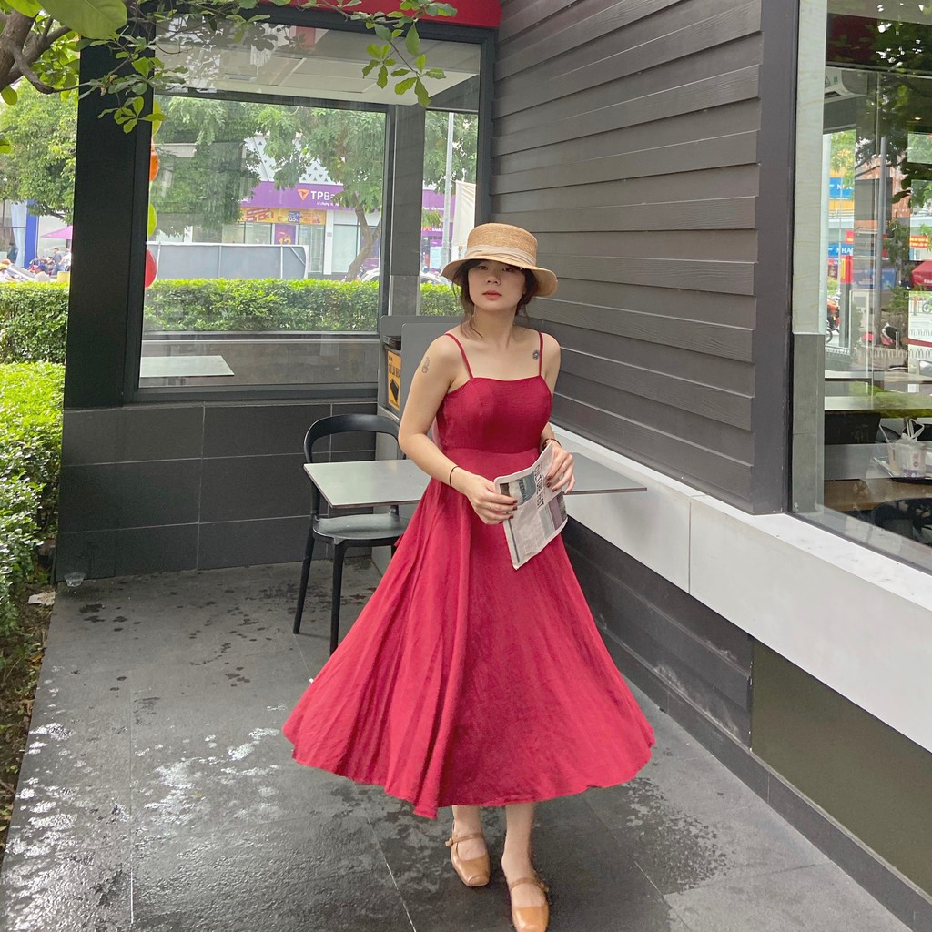 Bộ sản phẩm: MAXI HAI DÂY LỤA XƯỚC ĐỎ FREESIZE DƯỚI 60KG.