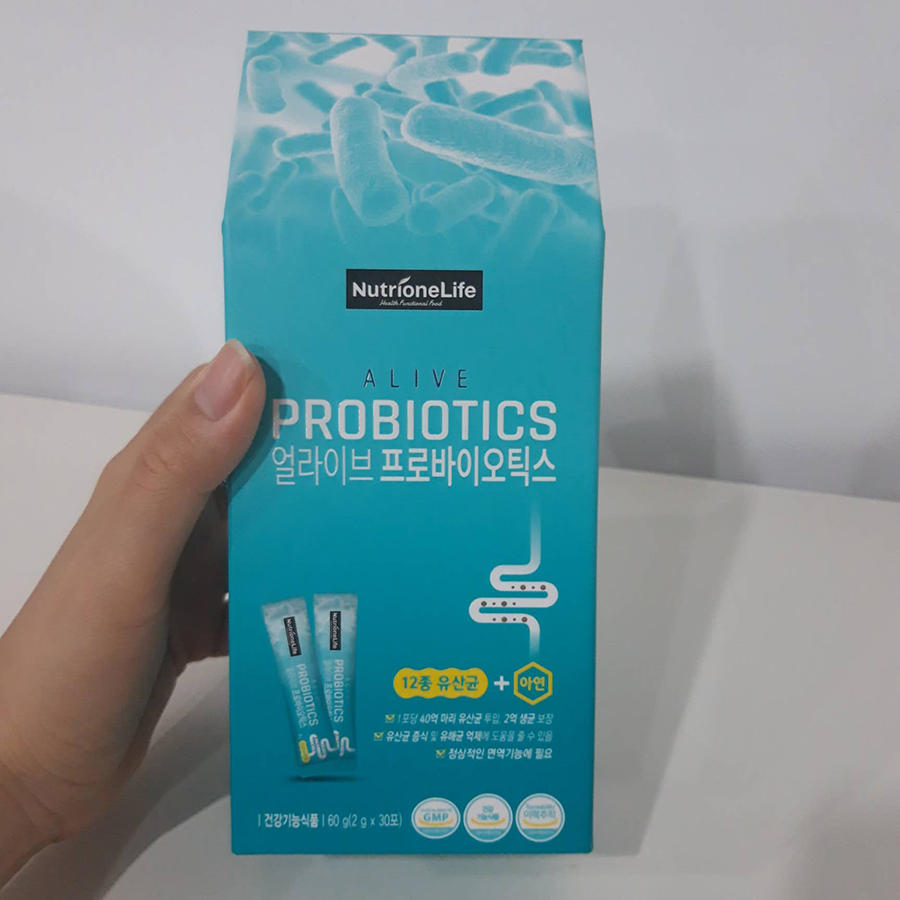 Bộ sản phẩm Men vi sinh Alive Probiotics (30 gói) chứa 12 chủng lợi khuẩn và Kẽm giúp giảm rối loạn tiêu hóa, tăng cường hệ miễn dịch cho trẻ em và người lớn, Thương hiệu NutrioneLife Xuất xứ thương hiệu Hàn Quốc Xuất xứ Hàn Quốc Hạn sử dụng 24 tháng SKU 5235151122317.