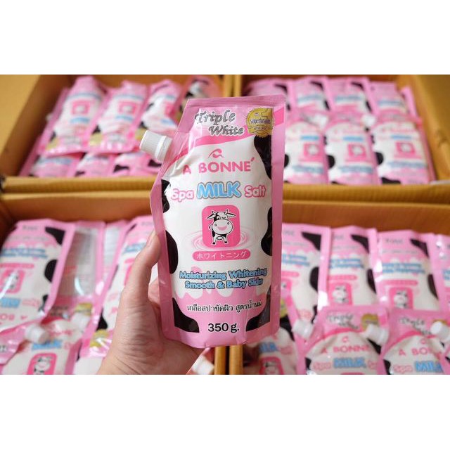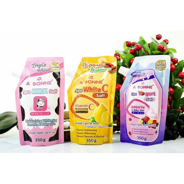 Dung tích: 350gr Xuất xứ: Thái Lan Muối tắm dánh cho body _Muối tắm trắng da vitamin C đu đủ và chanh (Spa White C salt): Sản phẩm chứa chiết xuất từ đu đủ với tinh chất chanh cùng gấp đôi lượng vitamin C trong sữa muối giúp làm trắng da, loại bỏ các tế bào chết trên da, ngăn ngừa sự phát triển của các loại vi khuẩn làm hại da, làm mịn tự nhiên, đồng thời kích thích sự tuần hoàn máu cho bạn một làn da khỏe mạnh. _Muối tắm trắng da sữa bò (Spa Milk Salt): Sản phẩm được bổ sung tinh chất từ sữa bò nên độ an toàn cao, không lo da bị dị ứng, giúp tẩy sạch bụi bẩn và tế bào chết. Protein từ sữa sẽ nuôi dưỡng làn da trở nên mềm mại và mịn màng. Chất dưỡng trắng chiết xuất từ thiên nhiên sẽ mang đến cho bạn làn da trắng hồng rạng rỡ. _Muối tắm trắng da sữa chua hoa quả (Spa Yogurt Salt): Đây là sự kết hợp hoàn hảo giữa muối tự nhiên và chiết xuất yogurt có tác dụng làm trắng da dưới cánh tay, bikini line và làm mờ sẹo thâm. Sản phẩm không những cung cấp dinh dưỡng cần thiết cho da với chiết xuất yogurt mà còn giúp loại bỏ bụi bẩn và tế bào da chết, kết quả cho bạn một làn da tươi mới, mềm mại và mịn màng hơn.