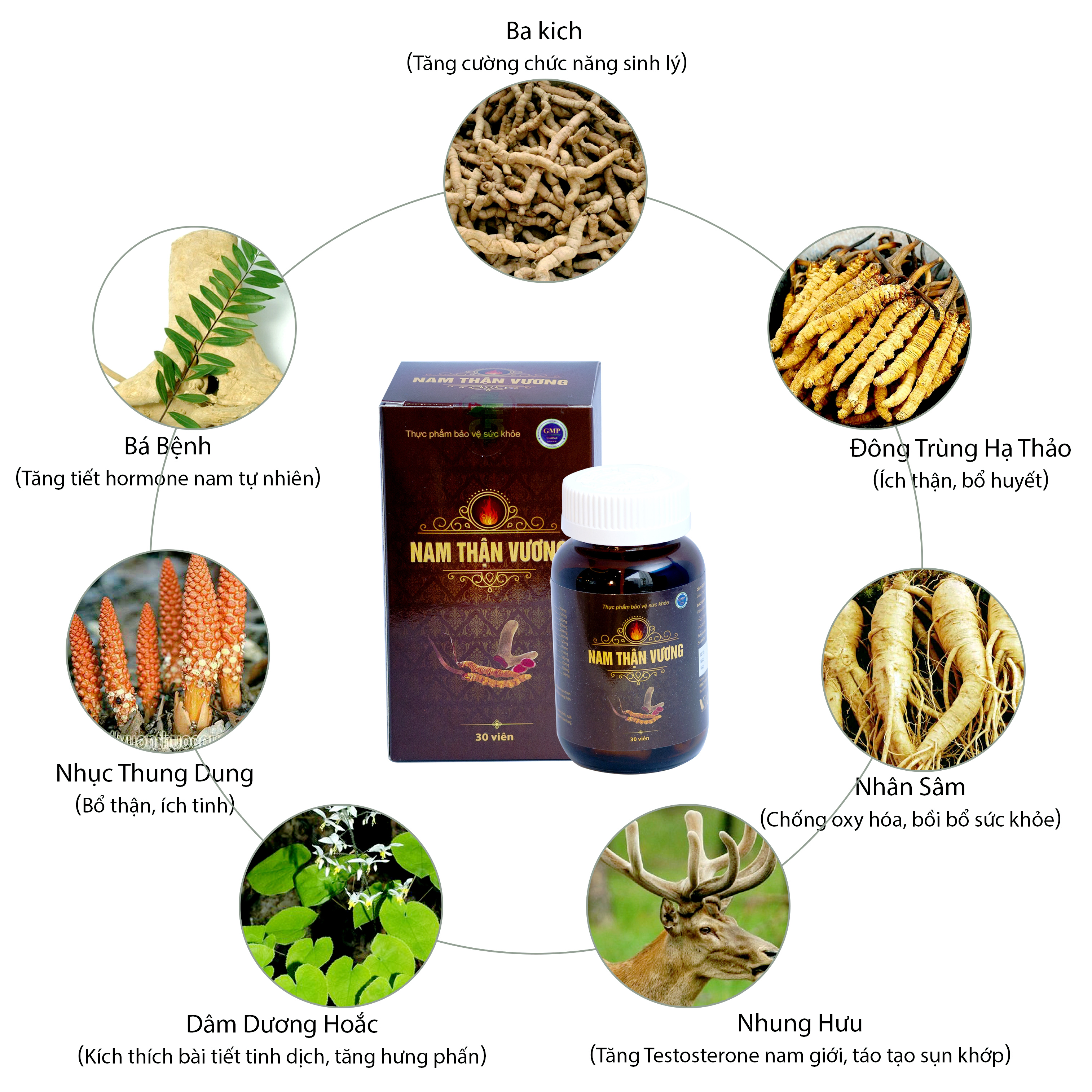 ★ VIÊN UỐNG NAM THẬN VƯƠNG – sản phẩm tốt cho sức khoẻ được Bộ Y Tế chứng nhận ★ Sản xuất tại nhà máy dược phẩm theo tiêu chuẩn GMP ★ Thực phẩm bảo vệ sức khỏe nam thận vương hỗ trợ bổ thận, tráng dương, tăng cường chức năng sinh lý, hỗ trợ làm chậm quá trình mãn dục nam, giảm đau lưng, mỏi gối, tiểu đêm nhiều lần do chức năng thận suy giảm. 1/ Thành phần Nam Thận Vương: – Eurycoma longifolia (bá bệnh), nhục thung dung, dâm dương hoắc, ba kích, thỏ ti tử, nhung hươu, nhân sâm, đỗ trọng, trâu cổ, đông trùng hạ thảo, kỳ tử, bạch tật lê, arginine, thành phần khác vừa đủ 1 viên 2/ Công dụng Nam Thận Vương: – Hỗ trợ bổ thận, cố tinh, tăng cường sinh lực, tăng cường chức năng sinh lý, làm chậm quá trình mãn dục nam. – Giảm tiểu đêm, tiểu nhiều lần, đau lưng mỏi gối, chức năng thận suy giảm. 2/ Đối tượng sử dụng Nam Thận Vương: – Nam giới chức năng sinh lý suy giảm với các biểu hiện: di sinh, mộng tinh, xuất tinh sớm, râu, tóc bạc sớm, yếu sinh lý. – Người bị suy giảm về số lượng tinh trùng, xuất tinh yếu, tinh trùng không đủ độ đậm đặc. – Người chức năng thận suy giảm: đau lưng, mỏi gối, ù tai, tiểu đêm, tiểu nhiều lần. 3/ Hướng dẫn sử dụng Nam Thận Vương: – Trường hợp muốn hỗ trợ những chứng bệnh mãn tính liên quan đến thận và nội tiết tố sinh dục nam thì dùng 2 lần trên 1 ngày, mỗi lần 2 viên. Sử dụng hết 1 liệu trình kéo dài 1 tháng – Hộp 1 lọ 30 viên 4/ Bảo quản: – Để nơi khô mát, tránh ánh sáng trực tiếp *** Lưu ý: sản phẩm không phải là thuốc không có tác dụng thay thế thuốc chữa bệnh