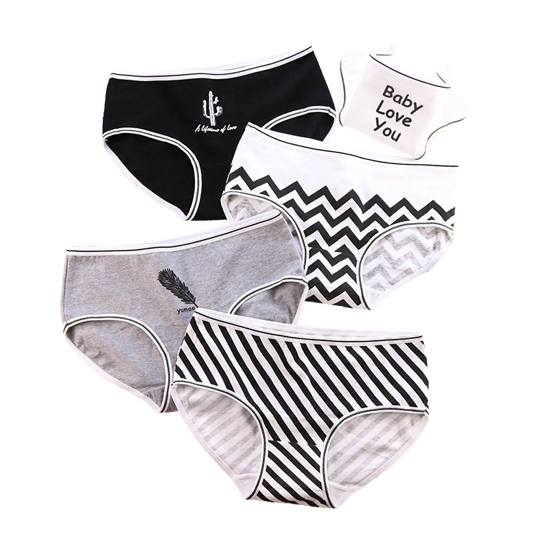 Fabric name: Total cotton Main fabric composition: Cotton Content of main fabric composition: 95 Crotch ingredients: Cotton Content of ingredients in crotch: 95 Style: Triangle pants Origin: Shanghai Functions: Breathable Functions: No trace Functions: Typed Seamless: No Waist size: Middle waist Design features: No trace Design features: Printing Range of errors: 2cm Category of applicable population: Adolescent girls Form of packaging: Short cost Color: Color random mixing Color: Black (Cactus) Color: White (Waves) Color: Gray (Feathers) Color: White (English) Color: Black and white (Oblique strips) Color: Four loads (Color random)