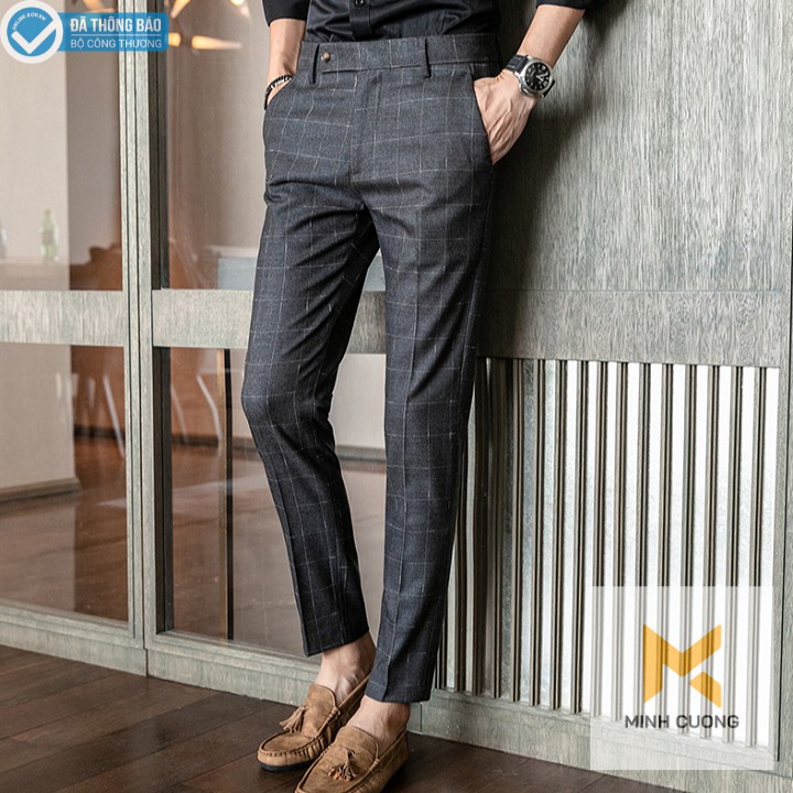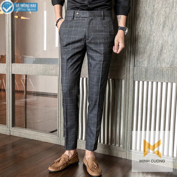 Bộ sản phẩm: Quần tây nam kẻ caro, ống côn, vải cotton cao cấp phối siêu hợp với áo sơ mi, giày da .